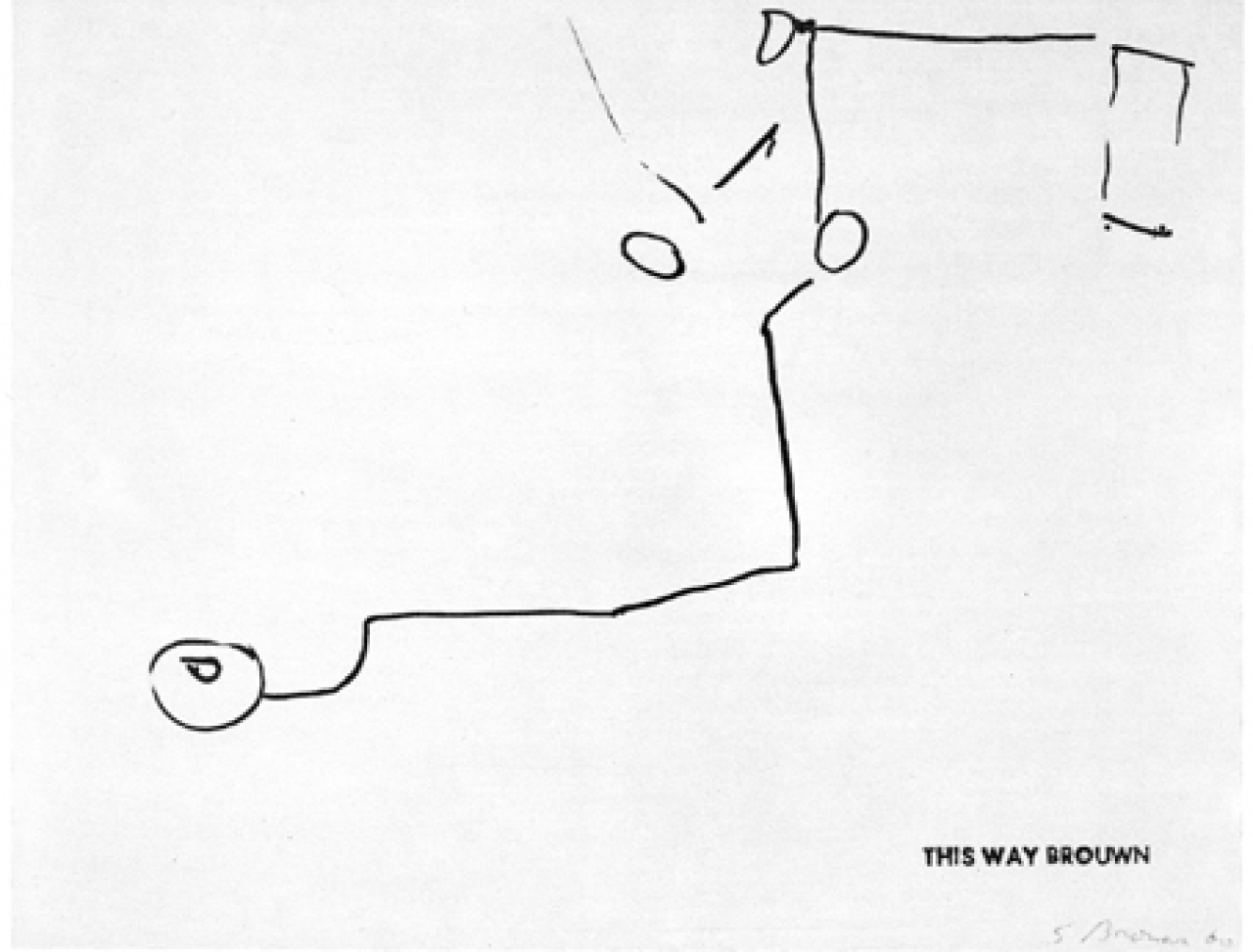 Het systeem van Brouwn stelt de individuele maat tegenover de objectieve maat. Het ondervraagt het principe van de ordeningen op een directe wijze. Elke voetstap is deel van de kosmos, de meter is een door mensen daaroverheen gelegde maat. De menselijk maar, de voetstap, staat daarmee als natuurlijke maat tegenover het keurslijf van het systeem. Brouwn gebruikt de methode van de wetenschap om juist de mystiek van het leven op te roepen. Als een echte onderzoeker gaat hij zelfs experimenten aan. Op straat vraagt hij willekeurige voorbijgangers de weg en laat hen die uittekenen op papier. Onder de titel This way Brouwn (vanaf 1968) wordt deze persoonlijke visualisatie van afstand en ruimte onderdeel van het universum van de kunstenaar.