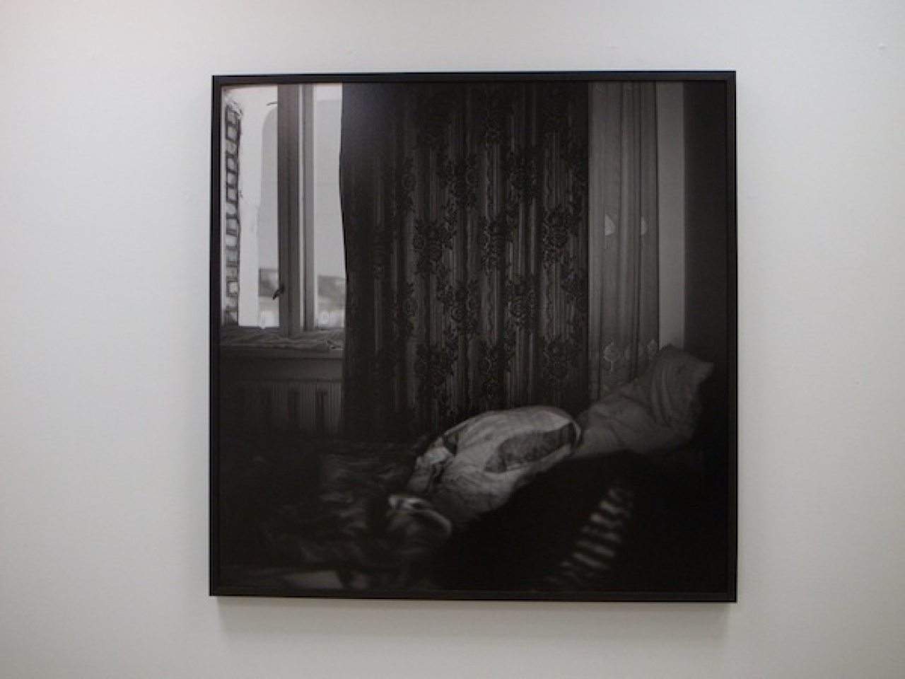 De kamers op de foto’s van Ine Lamers zijn donker, duister en verlaten. De ouderwetse karige inrichting leidt je in gedachten ergens richting Oost Europa. Het lijkt een studie naar de gordijnen en de bloemen die zo onnadrukkelijk aanwezig zijn in het interieur; op de sprei van een Freudiaanse sofa, op de vitrage en op de gordijnen zelf. Een handdoek ligt in de vensterbank. Iedere foto kent grote onscherpe delen. Een foto is totaal wazig. Iemand houdt zijn hand voor de lens, mogelijk. Onbehaaglijk. Een verhoorkamer buiten gebruik. Een appartement waar een dissident dood is gevonden en nu wil niemand daar meer wonen. Er hangt een naargeestige sluier over deze kamers. Goed in de hoeken sprayen. De serie foto heet ‘Intruders‘.