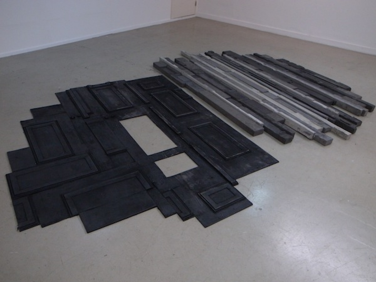 Het oorspronkelijke materiaal, zoals de houten delen van de parketvloer kunnen worden vervangen, door zwart geblakerde stukjes cement. ‘Fragments shored agains the ruins’, 2014. Met ijzerdraad zijn de delen aan elkaar gezet en nu hangt er een soort badmat over een lijn. Maar meer nog een niet precies te duiden beest dat uiterst ongemakkelijk over die lijn in evenwicht probeert te blijven en in mijn hoofd hoor ik hem krijsen van de pijn. Een trapleuning is doorgezaagd. De wieken van een ventilator omgevormd tot bloemblaadjes en zweven nu rond een stengel van staal. Calder-achtig. Blaadjes zijn besproeid met marmerspray of bedekt met mat zwart stof. Het huis is ontmanteld, zijn innerlijk blootgelegd, en je kunt je niet anders dan realiseren dat tijd geen vast materiaal is. Een installatie van deuren, exact dezelfde vormen maar in andere materialen: I lean to you, numb as a fossil. Tell me i’m here (2014)
