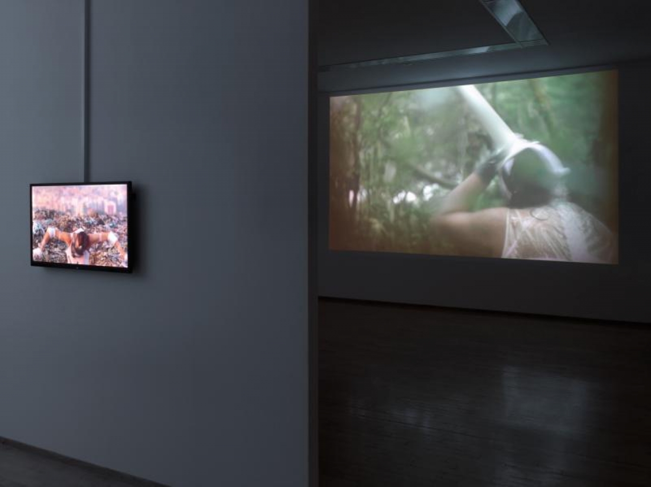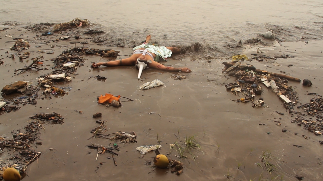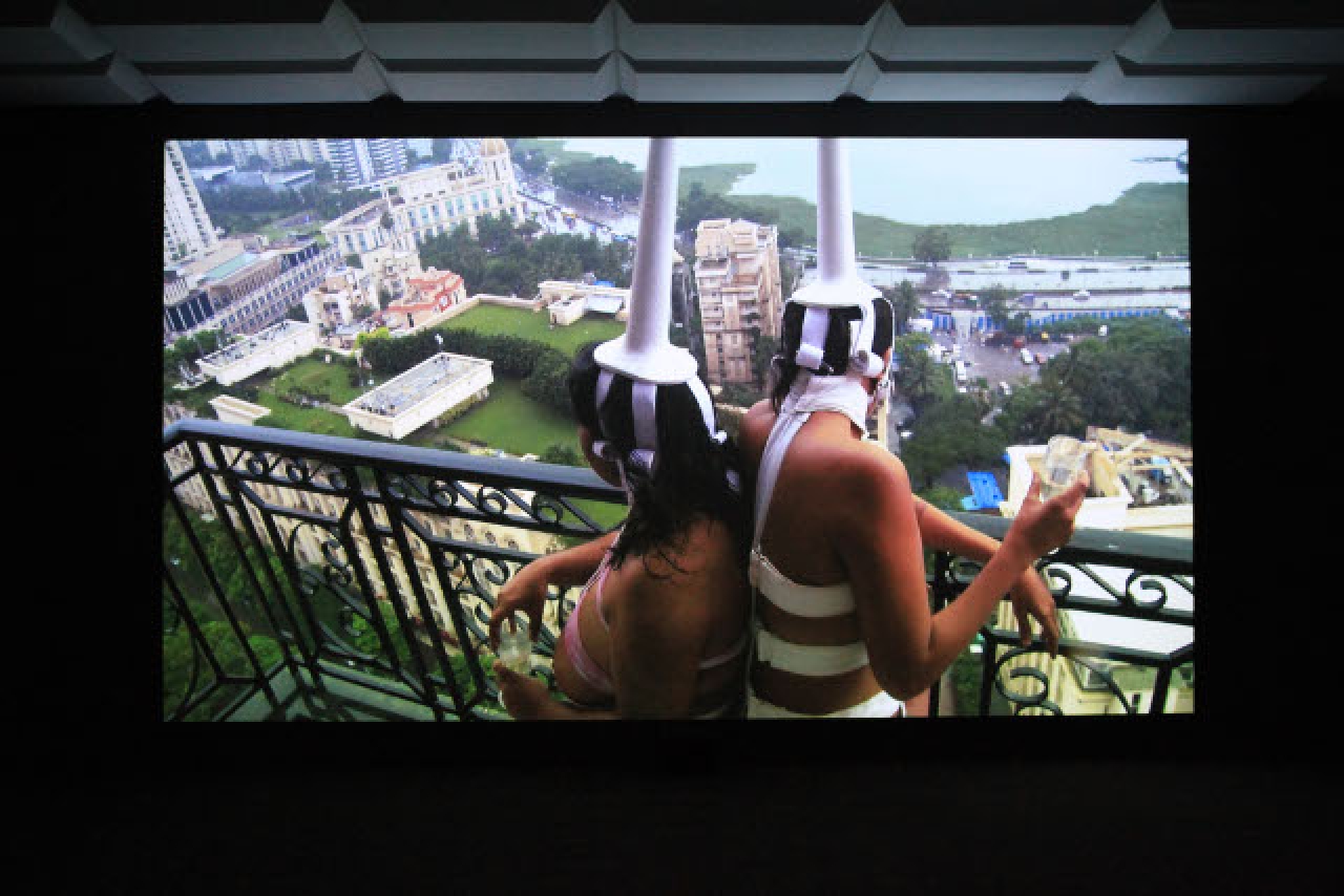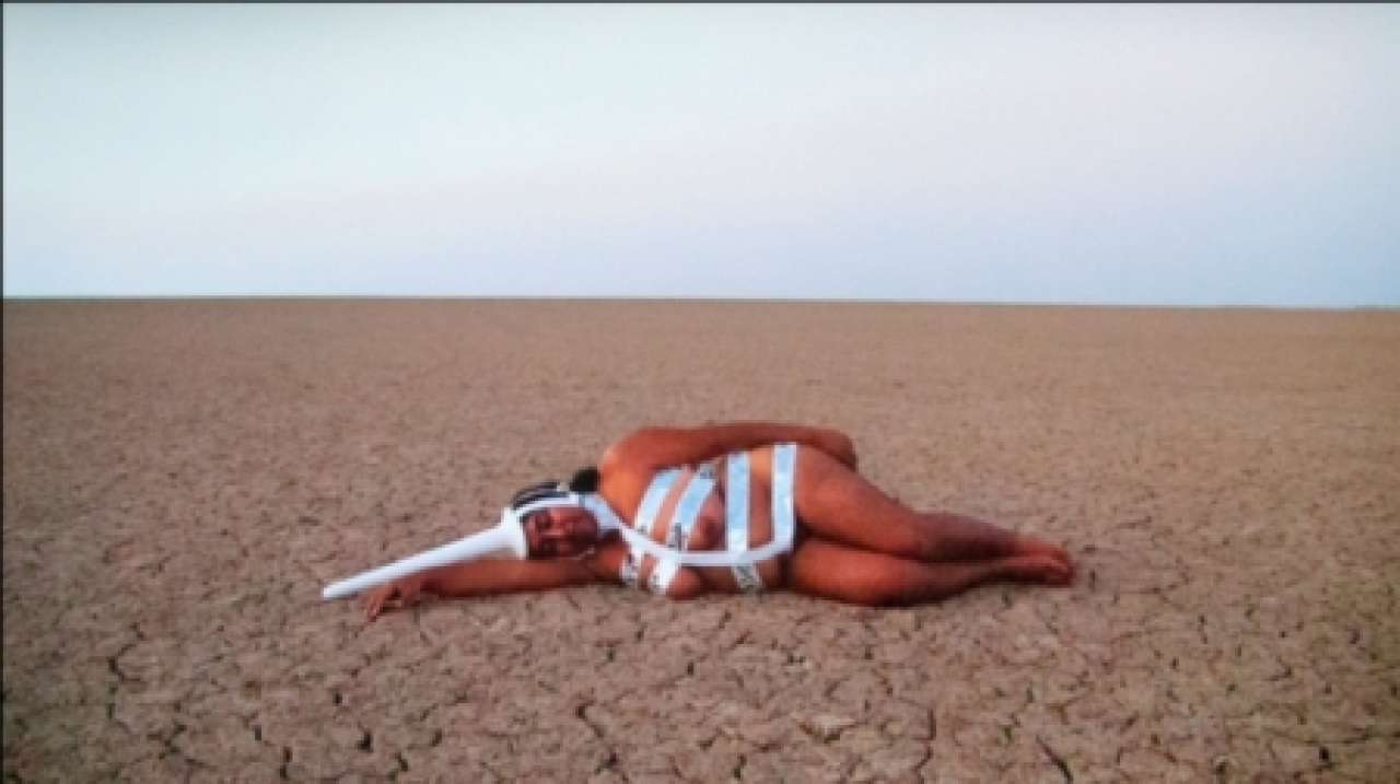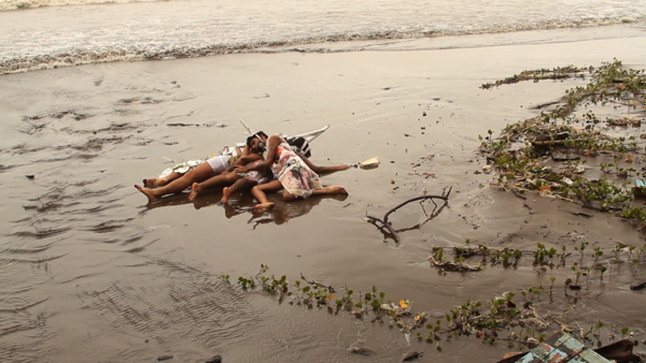 Between the waves (2012) van de Indiase kunstenaar Tejal Shah (Bhilai, 1979) maakt je loom en licht tegelijk. Haar video-installatie was afgelopen zomer te zien op Documenta (13) in Kassel, en kapselde het publiek in met lispelende geluiden en zintuiglijke, trage, vreemde beelden, even sprookjesachtig als ongepolijst. Er gleed een korstige dorre vlakte voorbij, een klam moerasbos, een glinsterende zoutpan, een zonbestoven ruïne. In de extreme landschappen zie je mensen in rare uitdossingen in de weer, ze verrichten halfslachtig onduidelijke handelingen. Twee vrouwen zie je steeds terug. De één is rondborstig en breedheupig als een prehistorisch vruchtbaarheidsbeeldje, de ander is ranker en heeft jongensachtig kort haar. Zij blijkt Tejal Shah zelf te zijn, zo ontdek je als je haar googelt. De andere vrouw zou haar geliefde kunnen zijn.