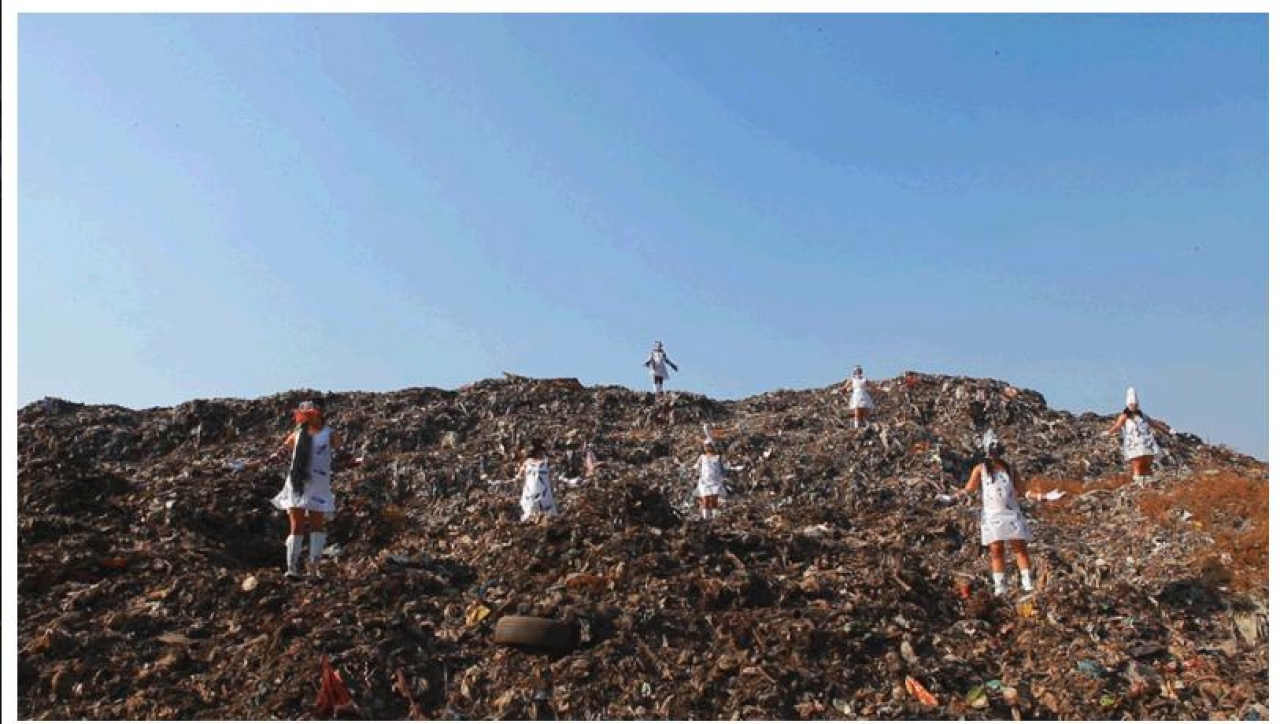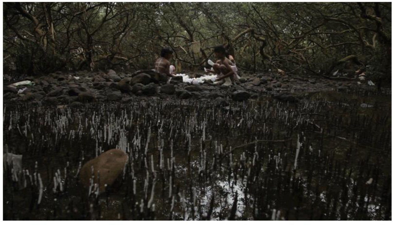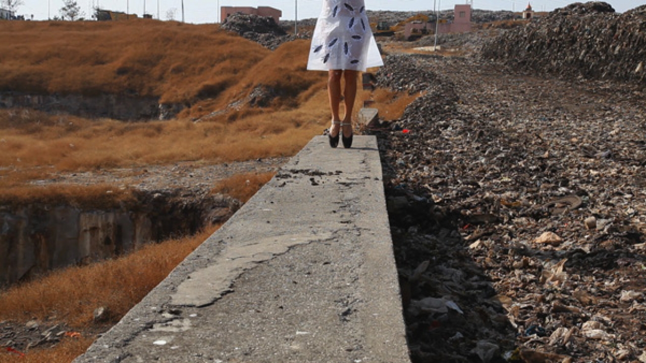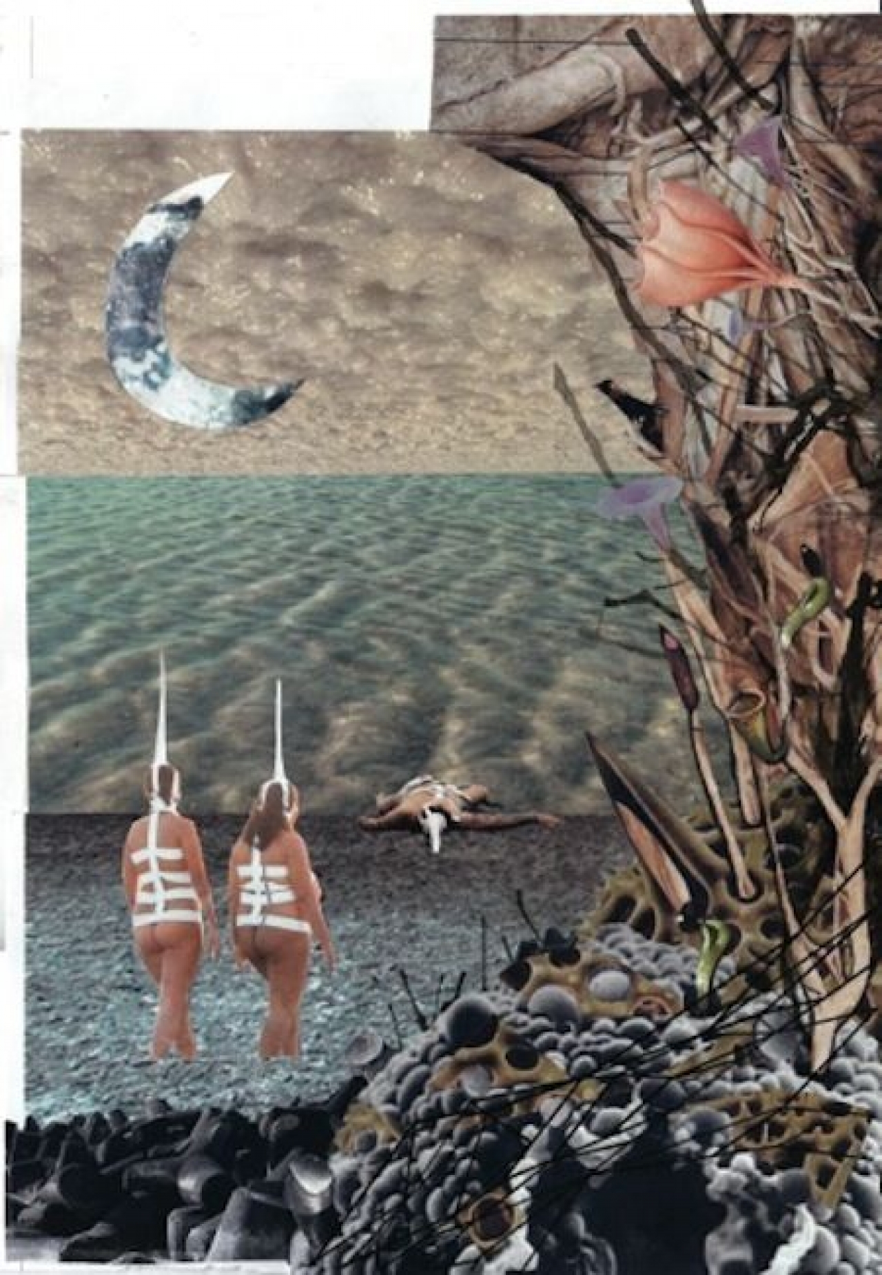 Between the waves (2012) van de Indiase kunstenaar Tejal Shah (Bhilai, 1979) maakt je loom en licht tegelijk. Haar video-installatie was afgelopen zomer te zien op Documenta (13) in Kassel, en kapselde het publiek in met lispelende geluiden en zintuiglijke, trage, vreemde beelden, even sprookjesachtig als ongepolijst. Er gleed een korstige dorre vlakte voorbij, een klam moerasbos, een glinsterende zoutpan, een zonbestoven ruïne. In de extreme landschappen zie je mensen in rare uitdossingen in de weer, ze verrichten halfslachtig onduidelijke handelingen. Twee vrouwen zie je steeds terug. De één is rondborstig en breedheupig als een prehistorisch vruchtbaarheidsbeeldje, de ander is ranker en heeft jongensachtig kort haar. Zij blijkt Tejal Shah zelf te zijn, zo ontdek je als je haar googelt. De andere vrouw zou haar geliefde kunnen zijn.