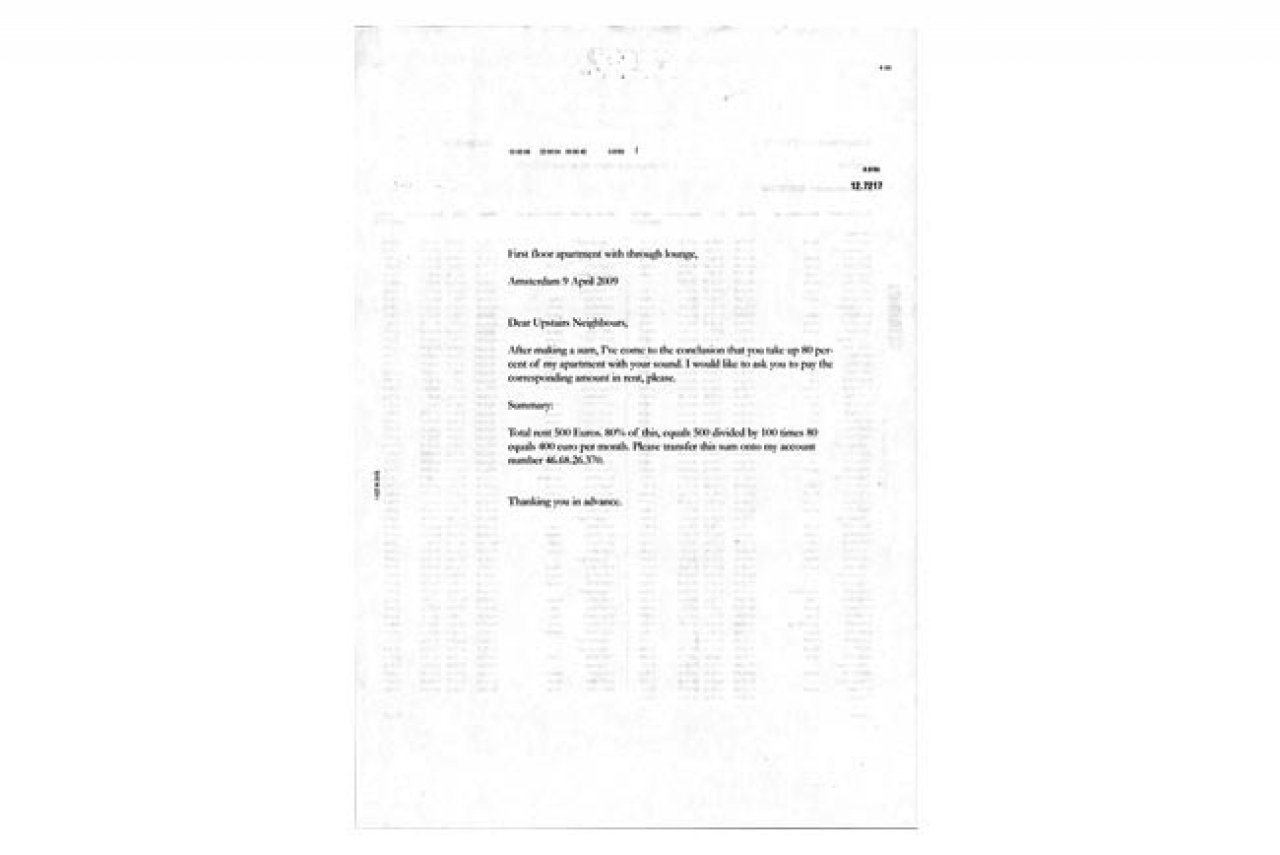 1 Tijdens mijn afstudeerproject sloeg mijn ergenis om in een soort angst dat de overlast op zou houden en ik mijn studieobject kwijt was. En na mijn verhuizing had ik ook weer last van mijn buren, het werd me erg duidelijk dat de geluidsoverlast in de eerste en laatste plaats een mentale kwestie is. Je zou mijn brief kunnen kopieren maar nog beter is een eigen projekt te bedenken waarin het geluid van de buren centraal staat. Kunst kan maken dat je het gaat waarderen (al hoeft je het projekt niet meteen een kunst status toe te kennen)