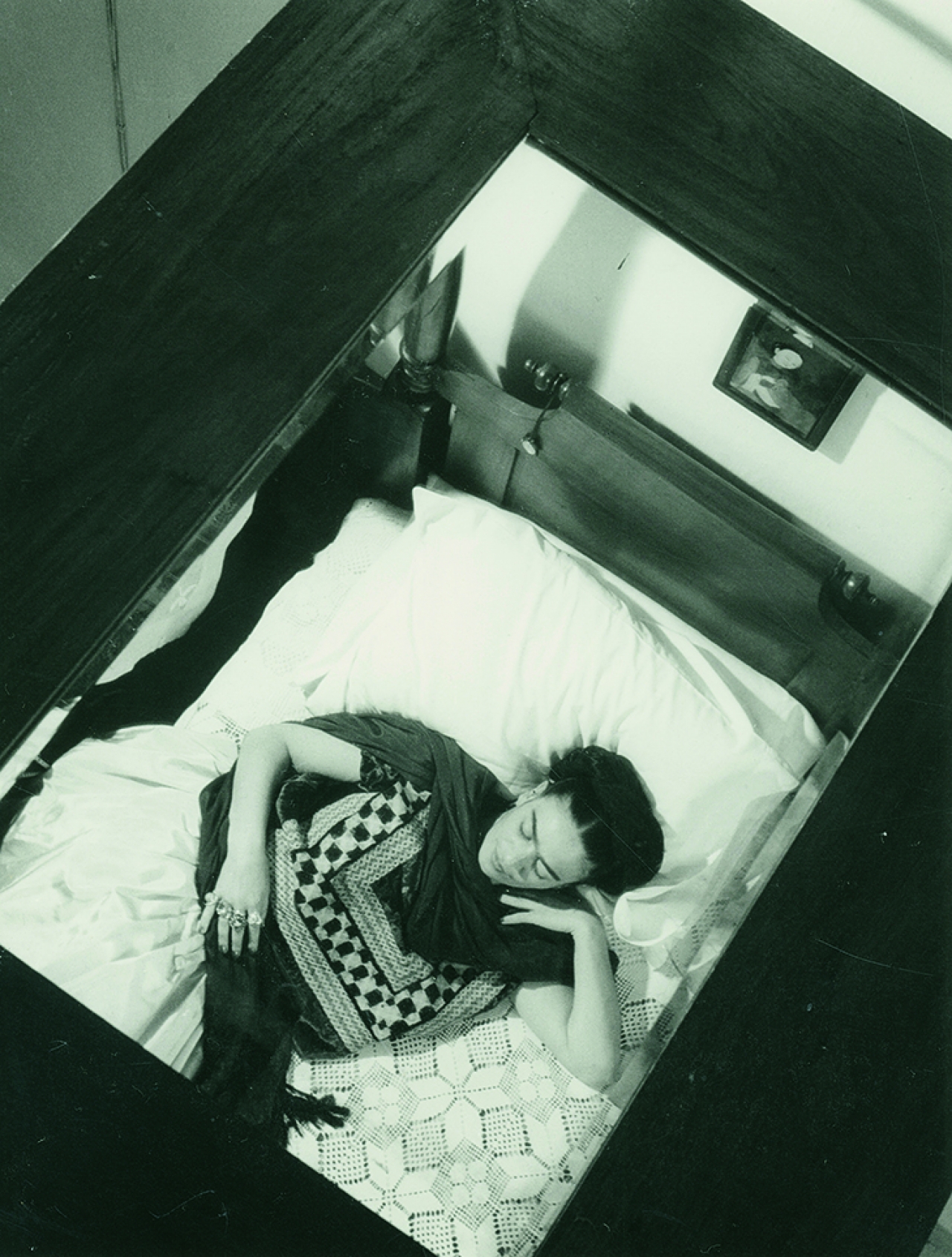 Als je een zelfportret maakt bekijk je jezelf en ben je tegelijkertijd degene die terug kijkt. Het is zowel je eigen blik als de blik van de ander. Wat mij treft aan dit specifieke portret van Frida Kahlo, die zichzelf zo goed lijkt te kennen, of zichzelf toch in ieder geval keer op keer op een specifieke manier te hebben neergezet, is dat de fotograaf Lola Alvarez Bravo Kahlo geportretteerd heeft van bovenaf. Je ziet jezelf in het dagelijks leven alleen van bovenaf als je dissocieert, en dan is er meestal iets niet goed. Maar in dit geval biedt deze foto een unieke blik op Kahlo, zowel voor de buitenstaander als – mag ik aannemen- ooit voor Kahlo zelf, omdat ze nu eens niet ziekelijk op bed ligt, omdat ze nu niet haar eigen blik volgt, maar er opnieuw en anders naar haar gekeken wordt, vanuit een enigszins erotisch perspectief. Soft focus. Alsof de fotograaf Lola Alvarez Bravo zich straks naast Frida Kahlo zal vleien en zij elkaar in het oor zullen fluisteren: ik heb je gezien.