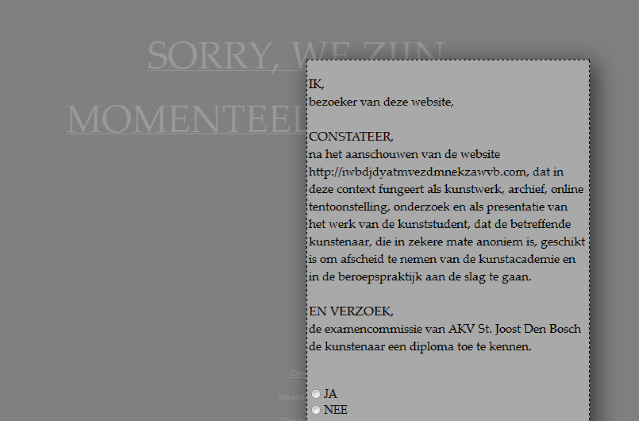 Het is een bemoeienis / ingreep / inmenging / tussenkomst die je bedrijft / begaat / verricht. Het is ook niet zonder reden dat een interventie altijd reageert op de situatie waarin deze plaatsvindt. Zonder context valt er niets te bemoeien. Het klinkt bijna als een misdaad, zo’n ongewenste handeling. Om die reden probeer ik mijn werk als een kameleon te laten functioneren, zodat men niet in de gaten heeft dat er sprake is van een kunstwerk. Op deze wijze kan met het werk tegenkomen zonder enige aannames over wat ‘kunst’ zou moeten of kunnen zijn.