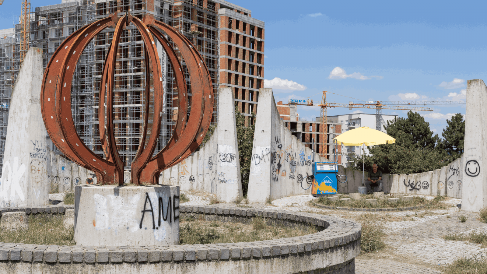 In Pristina wordt middels kunst een alternatief geboden door te laten zien dat de complexiteit van de geschiedenis niet uit de weg gegaan hoeft te worden. In plaats daarvan kan er steeds een nieuwe laag van betekenis worden toegevoegd, terwijl andere langzaam naar de achtergrond vervagen. Een mooi voorbeeld is het Partisan Martyrs’ Cemetery Monument, de locatie voor de interventie van kunstenaar Sislej Xhafa. Dit monument werd in 1961 opgericht ter nagedachtenis aan oorlogsslachtoffers van de Tweede Wereldoorlog. Het ontwerp, met in het midden een globe, verwees naar universele (communistische) broederschap en eenheid. Sinds 1999 dient het tevens als begraafplaats voor soldaten van het Kosovaarse bevrijdingsleger en in 2006 werd de eerste president van Kosovo, Ibrahim Rugova op deze locatie begraven. Vandaag de dag omlijsten de halvemaanvormen van het monument de toekomst van de stad waar in een razend tempo aan wordt gebouwd. Xhafa benadrukt al deze (zichtbare en onzichtbare) lagen door verschillende willekeurige (lijkende) rekwisieten, zoals een benzinepomp, een parasol en een stoel, toe te voegen aan een verhaal, dat nog verteld moet worden.