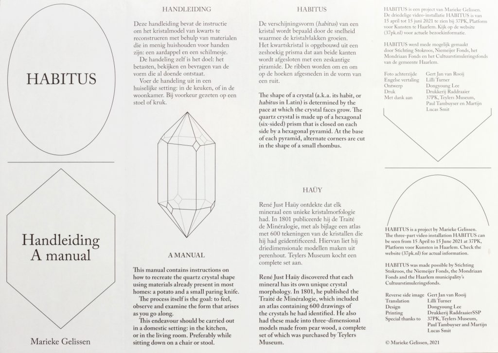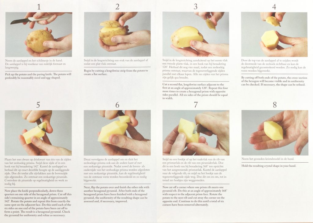 Begin 2021 maakte Marieke Gelissen een publicatie. In deze publicatie beschrijft ze stap voor stap met tekst en foto’s hoe je uit een aardappel de ideale kristallijne vorm van kwarts kan snijden. Haar publicatie is een document dat informatie over een bepaalde actie overdraagt. Zo’n document is een handleiding. Doorgaans wordt een handleiding pas opgesteld door een producent nadat de vorm en functie van een product bekend is. De handleiding heeft dan als doel informatie over de vervaardiging of het gebruik van het product over te dragen aan een onwetend publiek.