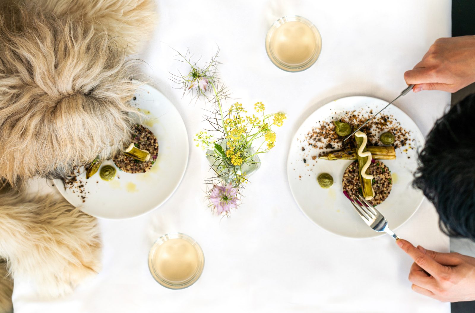 Maar het viel alleszins mee. Over de honden en hun prikkels was duidelijk goed nagedacht. De ontvangst was losjes, de dieren kregen de kans uit te razen en elkaar uitvoerig te bepotelen en besnuffelen in de ruimere kas van Mediamatic. Aldaar at mijn pup zowaar zijn amuse op zonder de bloemkool met yoghurt over de vloer uit te smeren. So far, so good. Na dat voorproefje toog de groep naar binnen om aan te schuiven aan de prachtige, scheenbeenhoge tafel waar de honden nog wat door rommelden, en de mensen op yogakussens plaatsnamen.