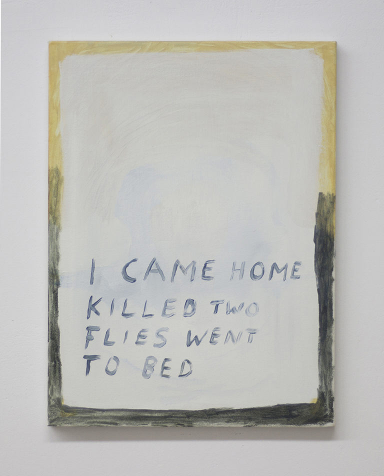 Onlangs raakte ik begeesterd door een schilderij van Vincent Verhoef. Het toont niet meer dan twee kleurvlakken, door een horizon van elkaar gescheiden, met daaroverheen een wit vlak – onderin de geschilderde zinnen I came home killed two flies went to bed. Een dagboeknotitie, vol van alledaagsheid.