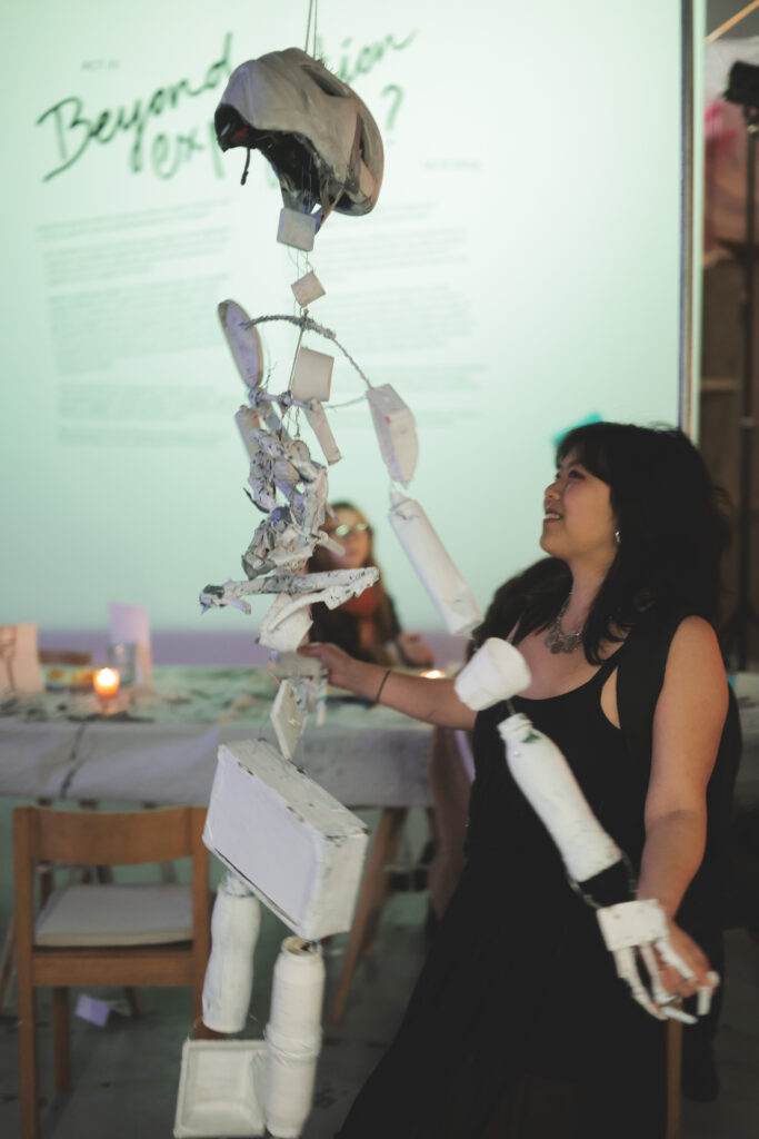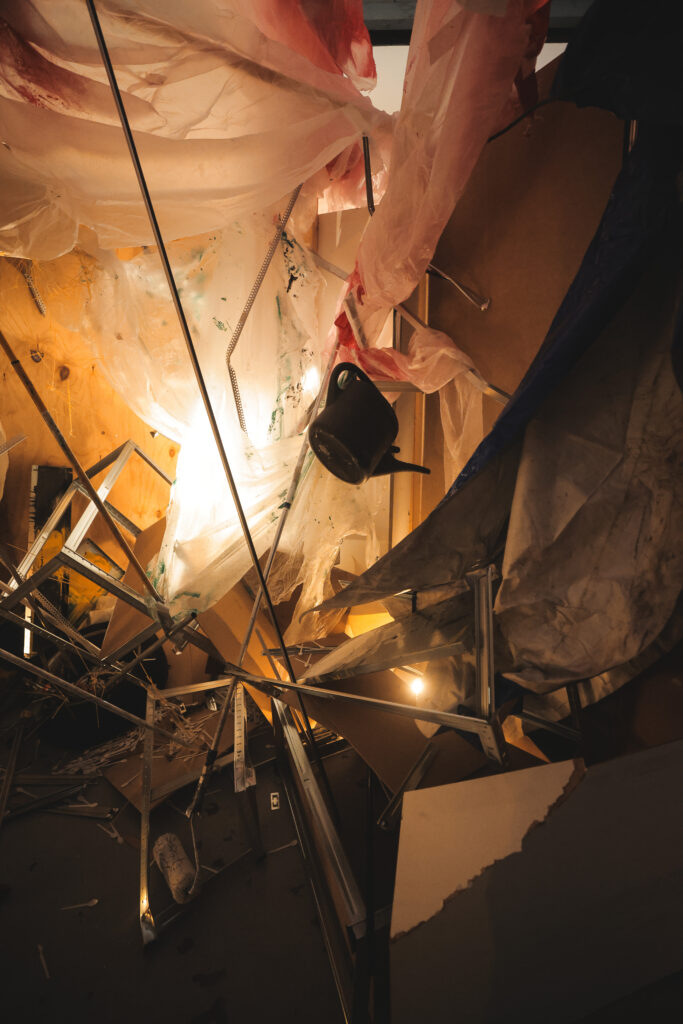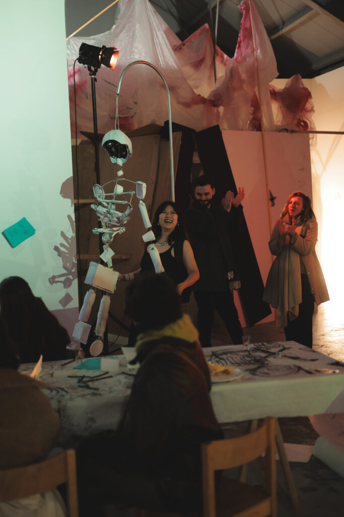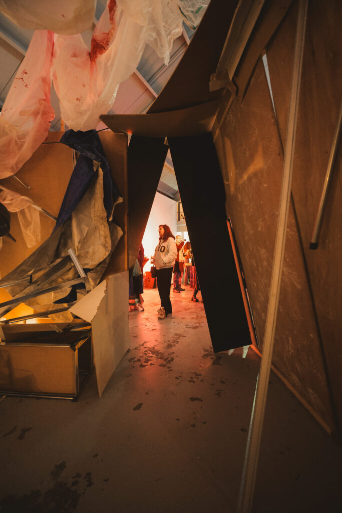 Er volgde een performance van kunstenaar An Ye Zhi de Jong die een dans uitvoerde met een uit afval opgebouwd skelet. Terwijl de kunstenaar door de ruimte walst, probeer ik te verwerken dat de instelling ophoudt te bestaan. Het is daarbij moeilijk om niet alles wat er te zien is in deze tentoonstelling en wat er gebeurt tijdens de opening te ervaren als een groot afscheid.