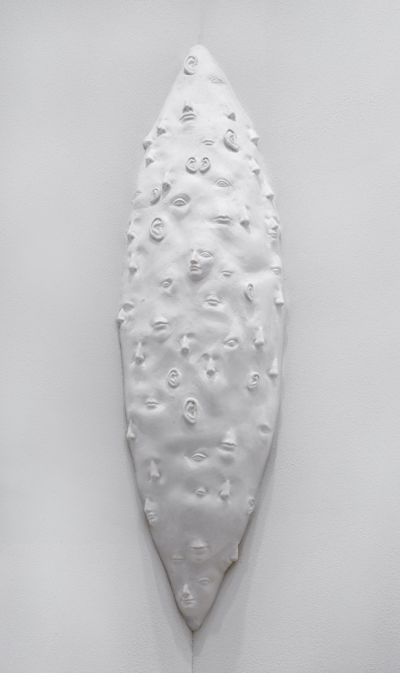 Afgelopen maand sprak ik met kunstenaar Derk Thijs en Shertise Solano. Deze week ben ik op bezoek bij het atelier van Femmy Otten in Scheveningen. Haar manier van werken is arbeidsintensief en ambachtelijk. Ze beitelt in hout, schildert met olieverf en werkt sinds een tijdje ook graag met marmer. Het afgelopen jaar was voor haar intensief. Haar tweede dochter was net geboren en ze moest alweer verder werken aan het megalomane project in de nieuwe rechtbank aan de Amsterdamse Zuid-as. Ze maakte dertien enorme werken (zeven sculpturen en zes muurschilderingen) voor de zeven grootste zittingszalen waar met ingang van 3 mei een deel van de rechtszaken in Amsterdam zullen plaatsvinden. Dat proces viel haar zwaar door de omvang van het project, de strakke deadlines en het gekaderde werkproces. Femmy is dan ook moe wanneer ik haar bezoek, maar voldaan. Veel mensen die in Amsterdam een rechtszaak bij gaan wonen, zullen haar witte hoeksculptuur zien waarin heel precies monden, neuzen en oren zijn verwerkt. Allemaal mensen die niet komen voor de kunst, maar er in die zaal ook niet onderuit kunnen.