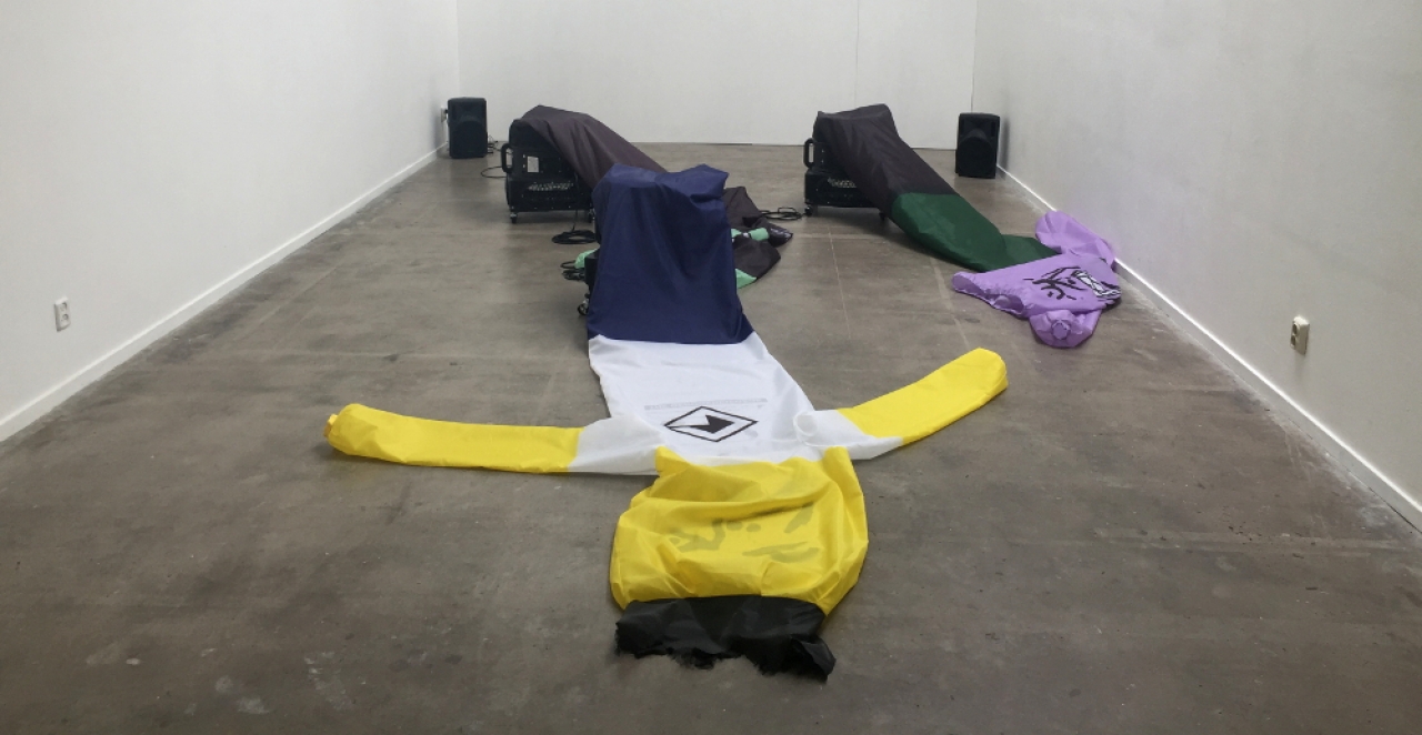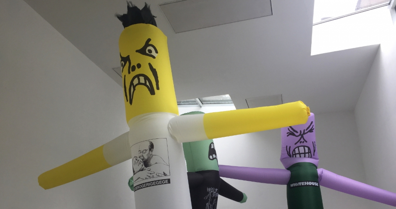 Bij binnenkomst word ik al gewaarschuwd: ‘Ik kan de installatie niet al te lang aan laten staan, want anders gaan de buren klagen’. Een harde ruis van windmachines, bijgestaan door onbestemde tonen, vecht zich een weg door de eerder zo vredige ruimte. Wanneer de schuimpjes in mijn oren zitten, verandert het gewelddadige geluid in een doffe dreun. Alsof de herrie mijn zicht hiervoor overschaduwde, krijg ik nu pas de mogelijkheid om de ruimte goed in me op te nemen. Drie steeds naar beneden vallende en weer opkrabbelende poppen kijken me aan vanuit de hoogte. Waar de figuren normaal gesproken een vrolijk onthaal vormen voor bezoekers van de opening van een nieuw voetbalstadion of winkelpand, lijken de poppen in 1646 minder onbevangen van aard. De wenkbrauwen van de voorste man – ik vind dat het mannen zijn – zijn zo donker, grillig bijna. Hij danst niet. Hij vecht. Met zijn tweekoppige achterban intimideert hij zijn kleine, nietige opponent die geen stap dichterbij durft te zetten.