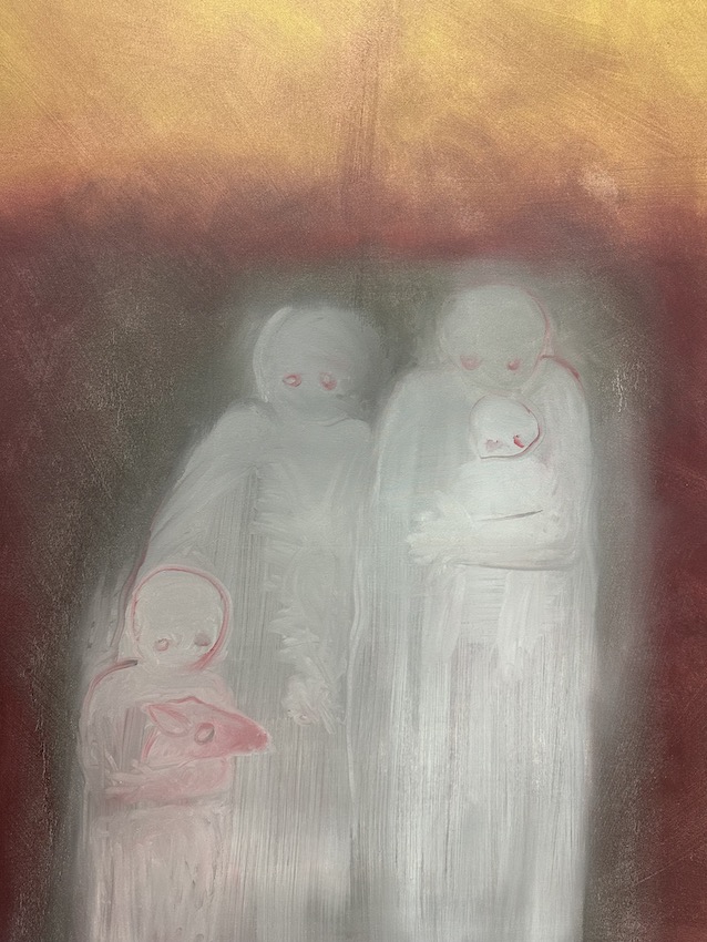 Een vluchtelingengezin verschijnt als een schim op het doek, bijna alsof ze al niet meer bestaan. Een volwassene draagt een kleine baby en een kind klemt een roze diertje in zijn armen. Op de achtergrond lijkt een stad te branden, de kleuren lopen links en rechts door naar de grond. Het gezin wordt geïsoleerd door die kleuren en dat correspondeert met de onverbiddelijke realiteit van gesloten grenzen.