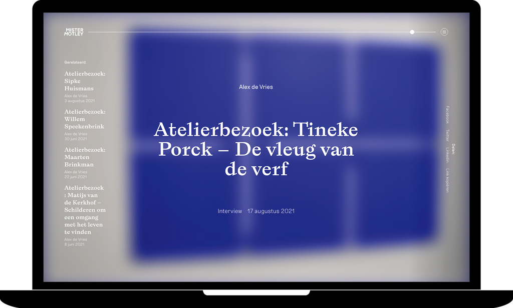 ‘We realiseerden ons ook dat Mister Motley vaak aandacht besteedt aan kunstenaars die je nergens anders vindt,’ vult De Bruijn aan. ‘Kunstenaars die niche zijn of nog nooit een grote prijs hebben gewonnen of niet zijn doorgebroken in de traditionele zin van het woord. De niet-mainstream kunstenaars. Wanneer je die online gaat zoeken, kom je al snel bij ons terecht, wat heel fijn is. Maar het zou niet de enige manier moeten zijn om die stukken te vinden. Bovendien: áls mensen dan eenmaal op de site zijn, willen we ze ook graag kennis laten maken met de rest van onze artikelen, niet alleen maar dat ene waarnaar ze op zoek waren.’
