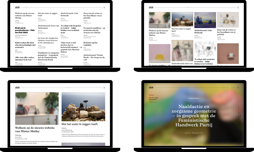 ‘We vonden dat de oude website niet meer voldeed,’ zegt Hulshof. ‘Het archief miste navigatie en structuur. De meest recente artikelen stonden bovenaan op de pagina, de oudere zakten steeds verder weg. En er was geen zoekfunctie. Toen Mister Motley in 2012 begon met het online archief, was dat nog geen probleem. Maar acht jaar en heel veel artikelen later is dat zonde. Wanneer mensen oude stukken hadden gelezen, konden we zien dat ze daar niet via onze website waren gekomen, maar via een zoekmachine. En zelf zochten we ook gewoon via Google in ons eigen archief. Dat klopte niet.’