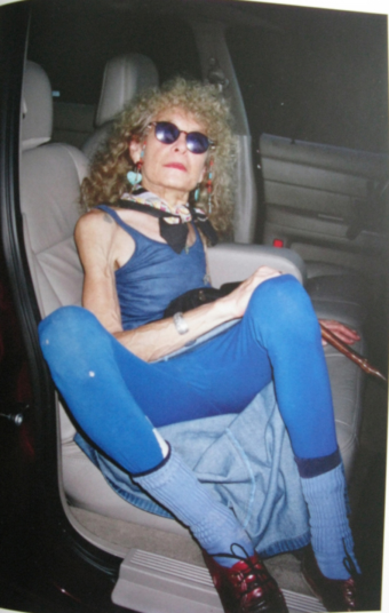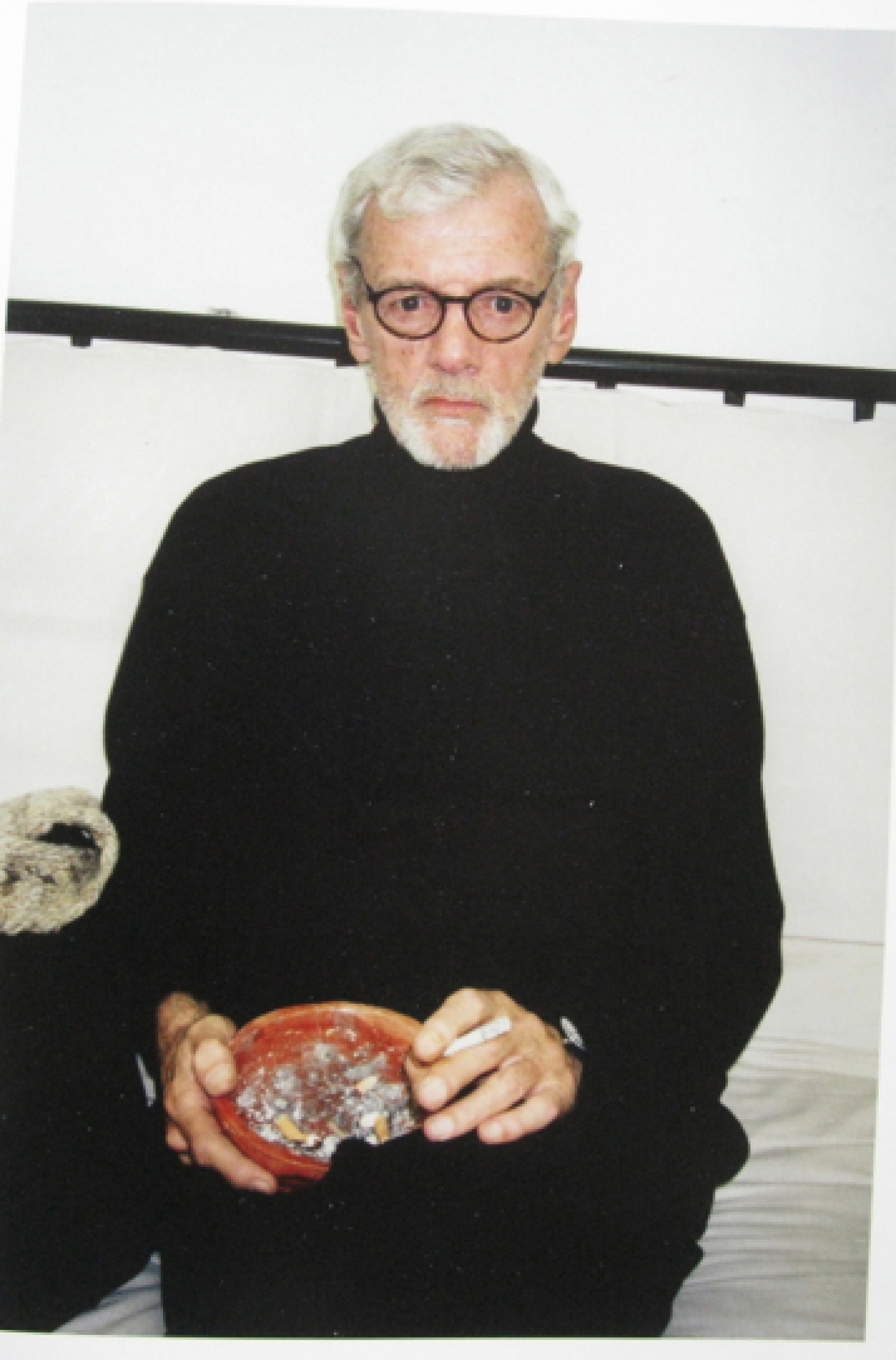 Twee zwarte boeken. Ik blijf er maar naar turen. Zijn moeder is een oude spijkerdunne bohemienachtige dame die een voortand mist. Ze is vrolijk en beschamend uitbundig. Een prachtig portret van een dame die een beetje gek aan het worden is, of misschien al is. Verval en verslonzing. Ik heb niet de indruk dat ze echt graag op de foto wil. Ze steekt haar middelvinger op, ze verbergt zich, ze duikt een keer weg. Het lijkt alsof ze steeds gekke bekken trekt om het allemaal nog erger te maken dan het al is, om niet mee te werken. Wie wil zijn moeder nu zo aan de wereld tonen? Bijna altijd rokend, een paarse zonnebril, blote borsten, sieraden en sjaaltjes.