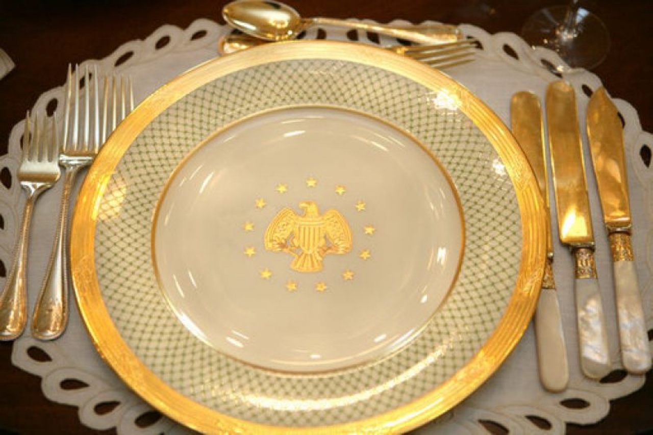 In kookboeken, in notities van presidentiële chef-koks, in dagboekfragmenten en bewaarde briefwisselingen tussen de First Lady en porselein fabrikanten kwam ik de overwegingen tegen, hoe de opdrachten luidden. In het begin staat het ontwerp van het Witte Huis servies sterk onder Franse invloed. De leiders van de Amerikaanse revolutie hadden in Frankrijk revolutionaire inspiratie opgedaan voor ze aan hun eigen strijd begonnen. Op terugreis namen ze koffers mee vol Frans servies en meubelen. Omdat er nog geen porselein in de VS gemaakt kon worden, bestelden ze het in Frankrijk. Dat is de reden dat de adelaar op de eerste borden meer een Franse lijkt dan de latere Amerikaanse zeearend.