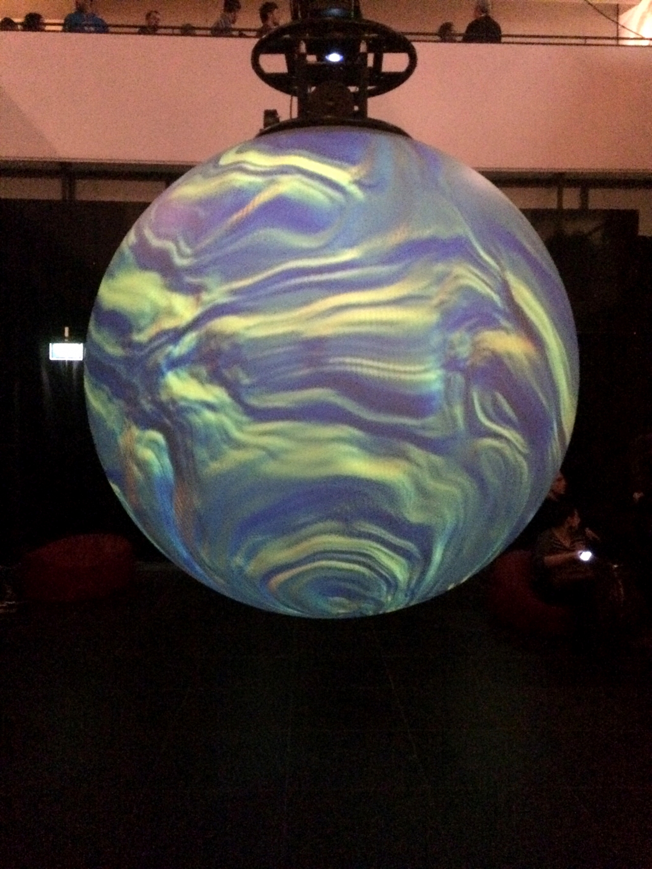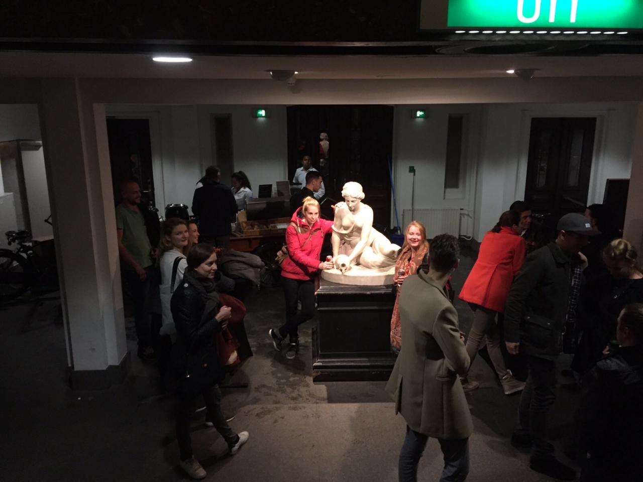 Een groot contrast met het bruisende gedruis op het museumplein wat natuurlijk niet aan de tour mag ontbreken. In het van Gogh slaat de klok inmiddels 1 uur ‘s nachts en ik besef me dat ik op een klaarlichte dag nog nooit museumbezoekers joelend met een biertje in de hand naar een schilderij heb zien kijken. In het van Gogh is naast de vaste collectie ook een interactieve videoprojectie op een immense bal gevuld met lucht te zien. Deze intelligente bal is ontworpen door kunstenaar Nick Verstand en gerealiseerd door hem en een team ontwerpers. De installatie communiceert door het interpreteren van onze geluiden en lichaamsbewegingen en toont karakter door hierop te reageren. Door dit gedragsmatige proces creëert de installatie de illusie zintuiglijk te zijn, waardoor wij er als mensen een relatie mee aangaan. Hoe meer biertjes men verorbert, hoe meer men denkt te weten hoe de installatie communiceert en reageert. Mensen rennen om, springen voor en prikken in de bal om de projectie te laten bewegen.