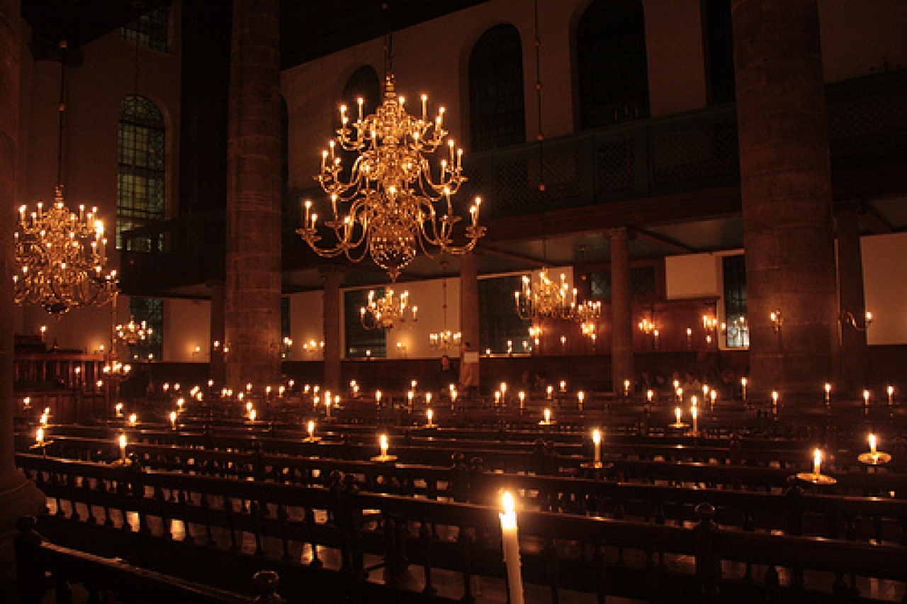 Per ongeluk beland ik in de Portugese Synagoge waar geen gekleurde lampjes, maar wit licht de ruimte verhelderd. Hier verlichten honderden kaarsen een oase van rust.