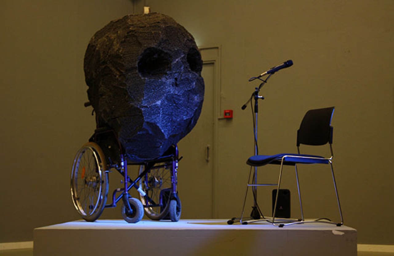 Uiteindelijk vind ik het dan toch, een klein podium in een grote expositiezaal waarop een vrouw achter een microfoon een gesprek voert met een gigantisch hoofd op een rolstoel. Ze vraagt met een monotone stem naar de klachten van het hoofd en hoe het hoofd zich erbij voelt, waarna deze steeds antwoord geeft op haar vragen met klachten over angsten. De cliënt heeft last van angstaanvallen en is paranoïde over haar veiligheid, terroristen zouden het wel eens op haar gemunt kunnen hebben. Ze vindt haar veiligheid bij een grote teddybeer als ze nachtmerries heeft over een ladder die haar de adem doet stokken.