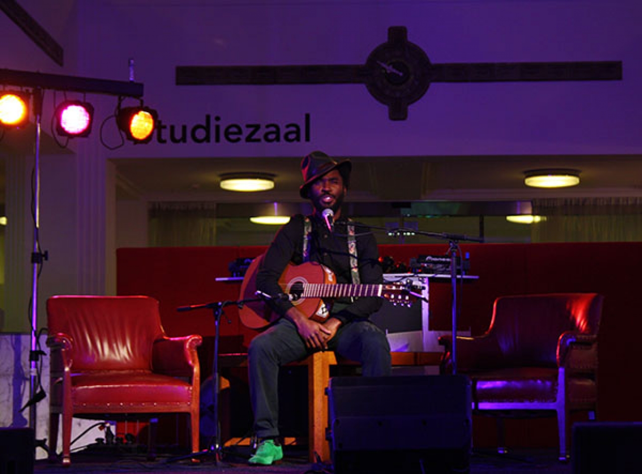 De route wordt vervolgd naar het stadsarchief waar bezoekers het ‘medicijn van vanavond’ ontvangen, in de vorm van een klein hoestdrankbekertje met water. Wanneer ik de hoek om loop tref ik een jongen genaamd U.N.O.M. met sprankelende ogen aan op een podium, hij zingt de laatste zinnen van zijn lied over dromen voor de wereld. Als hij uitgezongen is vraagt hij aan het publiek wie van ons er ooit zo veel liefde heeft gevoeld dat ze dachten dat het hun dood zou worden, een kwart steekt zijn hand omhoog. Wat volgt is een gedicht begeleid op gitaar met gezongen stukken tussendoor: “Murderin me…O-oh” is een zinsnede die hij blijft herhalen terwijl de passie van zijn hart, de microfoon in uit de boxen mijn oren in stroomt. Als het optreden voorbij is wordt de dreunde bas van de DJ ingezet, de jazzy hip-hop vult de hal van het Stadsarchief. Begeleid door deze feestelijke klanken verlaat ik het pand.