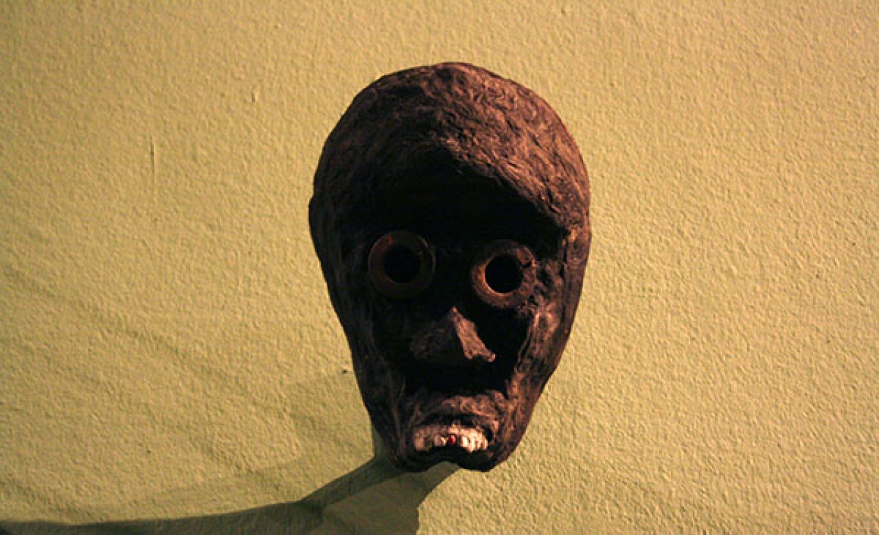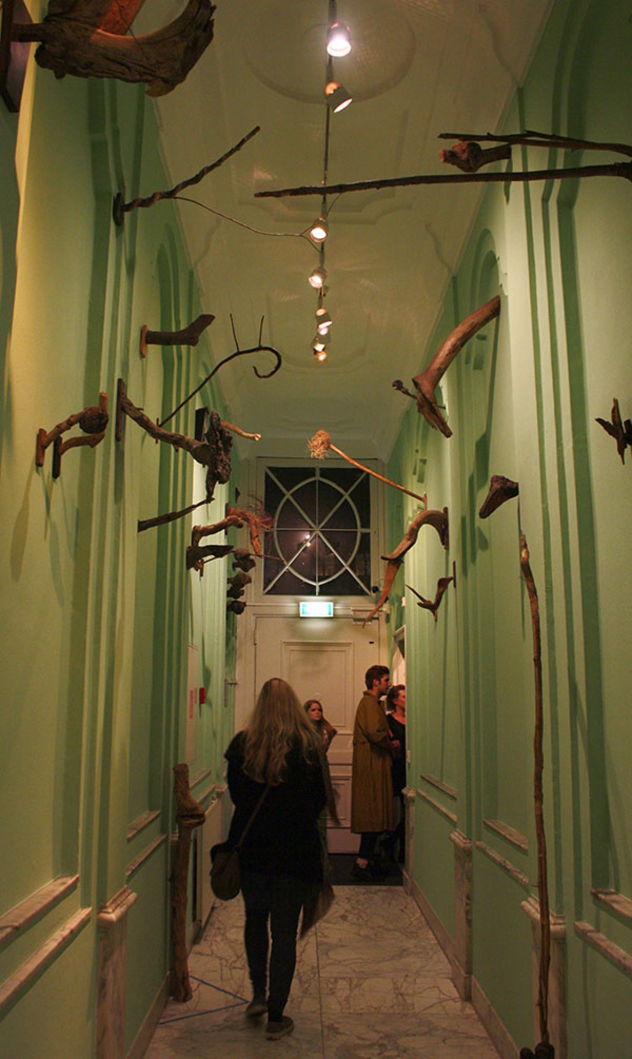 Het is bomvol in het Amsterdamse fotomuseum, waar ik mijn weg probeer te vinden door de smalle gangen naar My life in the bush of ghosts van Paul Bogaers, waar Dollkraut, de zogenoemde geluidstovenaar een begeleiding zal verzorgen voor deze geheimzinnige tentoonstelling. Een oerwoud van wilde wezens, takken en gezichten omringen de bezoeker als ze de grote ruimte van de expositie binnen gaan. Overal kijken starende ogen mij aan en weten mijn ogen op hun beurt niet waar ze als eerste naar moeten kijken: de muren zijn bezaaid met objecten van twijgen, schedels en stronken. Zelfs de ventilatieroosters zijn behangen met touwtjes en andersoortige sliertjes die wapperen in de kunstmatige wind.