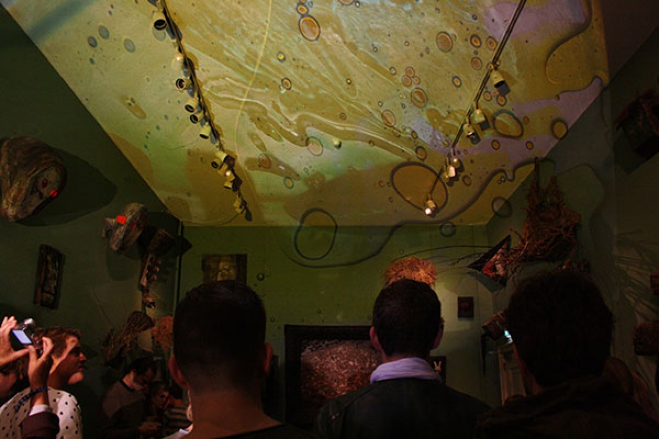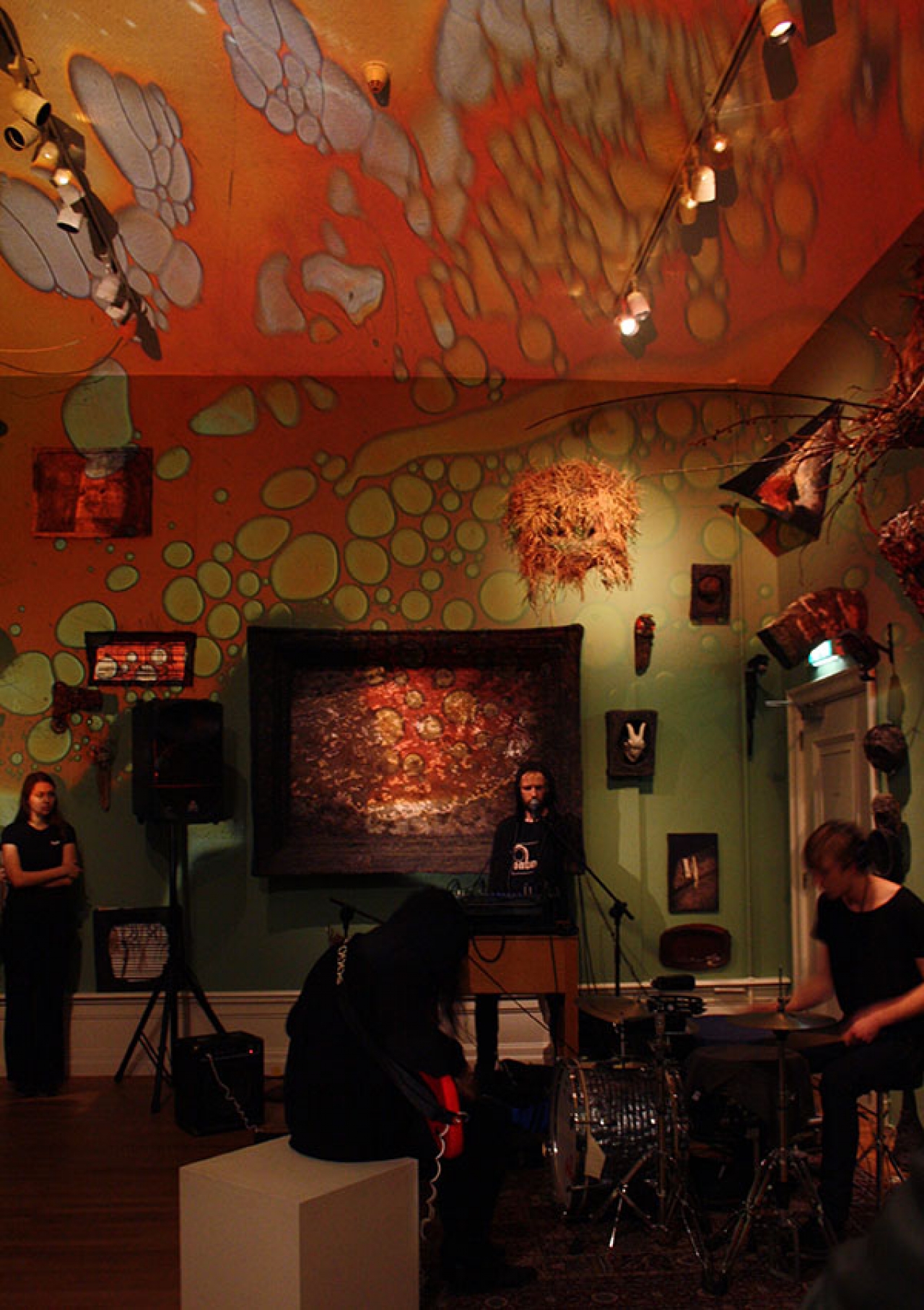 Als ik in een kleinere kamer verderop sta te kijken naar een schouwspel van gekleide lichamen waarop gezichten zijn bevestigd die allen naar een punt op de zoldering lijken te kijken, begint er in de grote hal een monotone, jammerende stem te zingen als die van een indiaan in de weer met zijn ritueel. De zang wordt begeleid door de opzwepende klanken van een synthesizer en een gitaar en een percussionist met een drumstel, koebellen en een tamboerijn maakt de verhitte muziek compleet. Terwijl de muziek door de ruimte dreunt, beginnen er kleurige vormen over de muren te dansen; projecties van twee overheadprojectors, waar drie vrouwen met glazen schalen, flessen zeep, scheutjes olie en kleine potjes met kleurstoffen spelen met het licht.