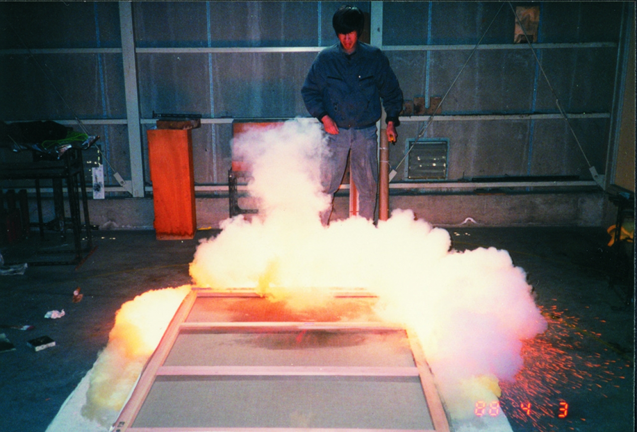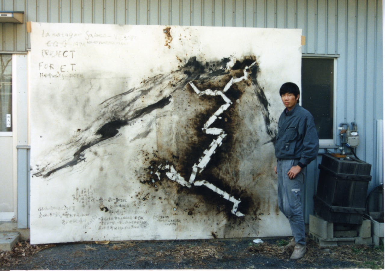 ”Naar aanleiding van de ‘Projects for Extraterrestrials’ begon ik buskruit op papier te gebruiken om er grootschalige explosies in de open lucht mee uit te drukken. Ik noemde deze schilderijen ‘buskruittekeningen’, ongeacht of deze projecten werden uitgevoerd of niet. Zo gaat ‘Bigfoot’s Footprints: Project for Extraterrestrials No.6’uit van de verbeelding dat buitenaardse wezens zich niets aantrekken van landsgrenzen en vrijelijk de lucht boven verschillende landen doorkruisen.’