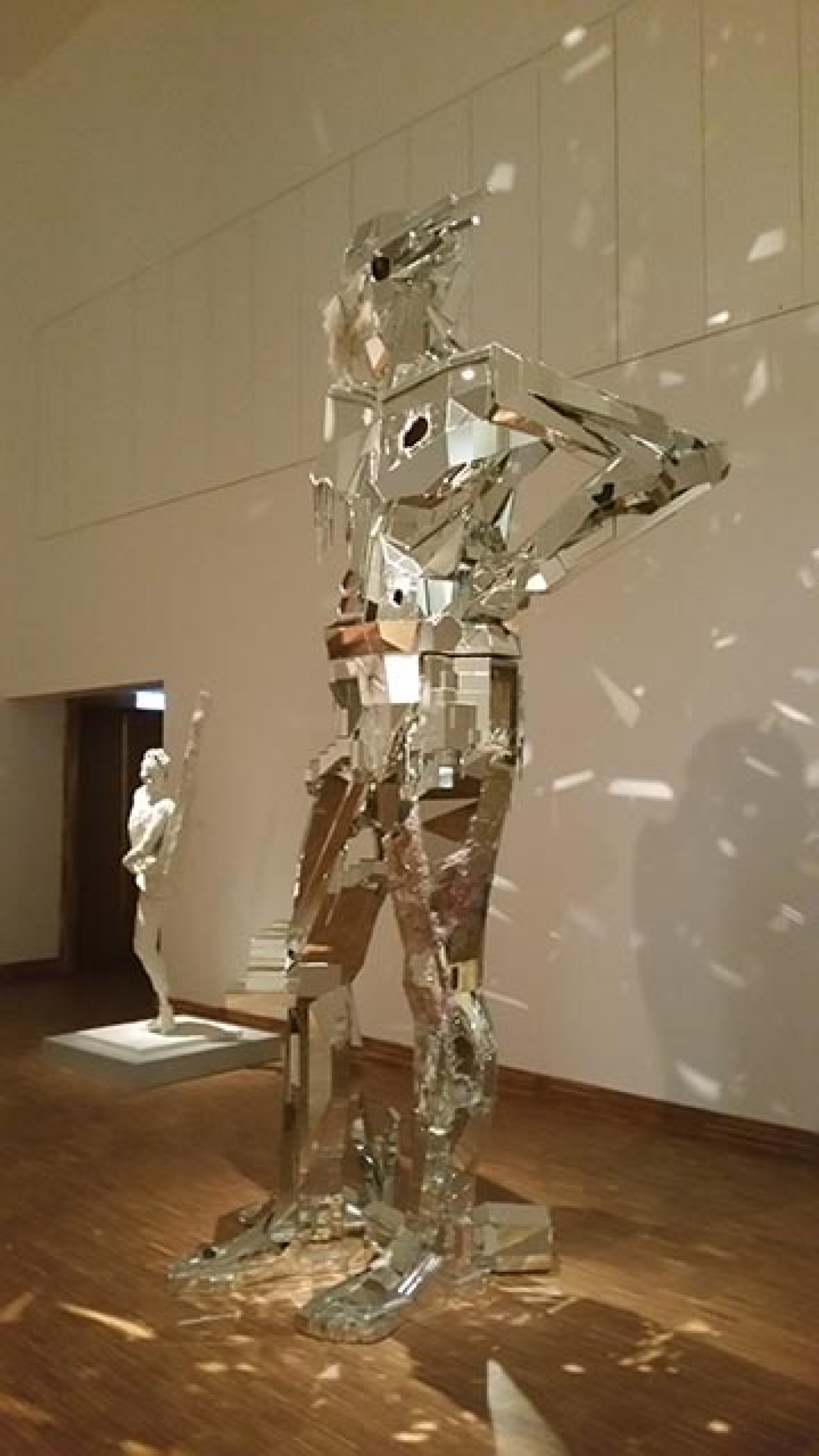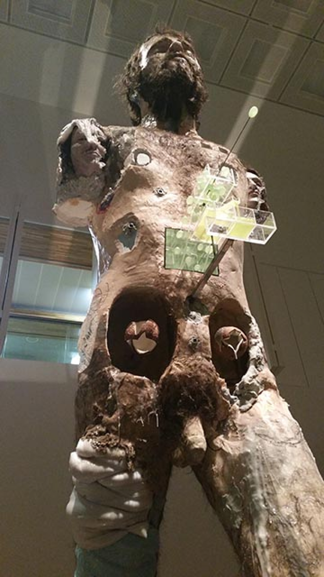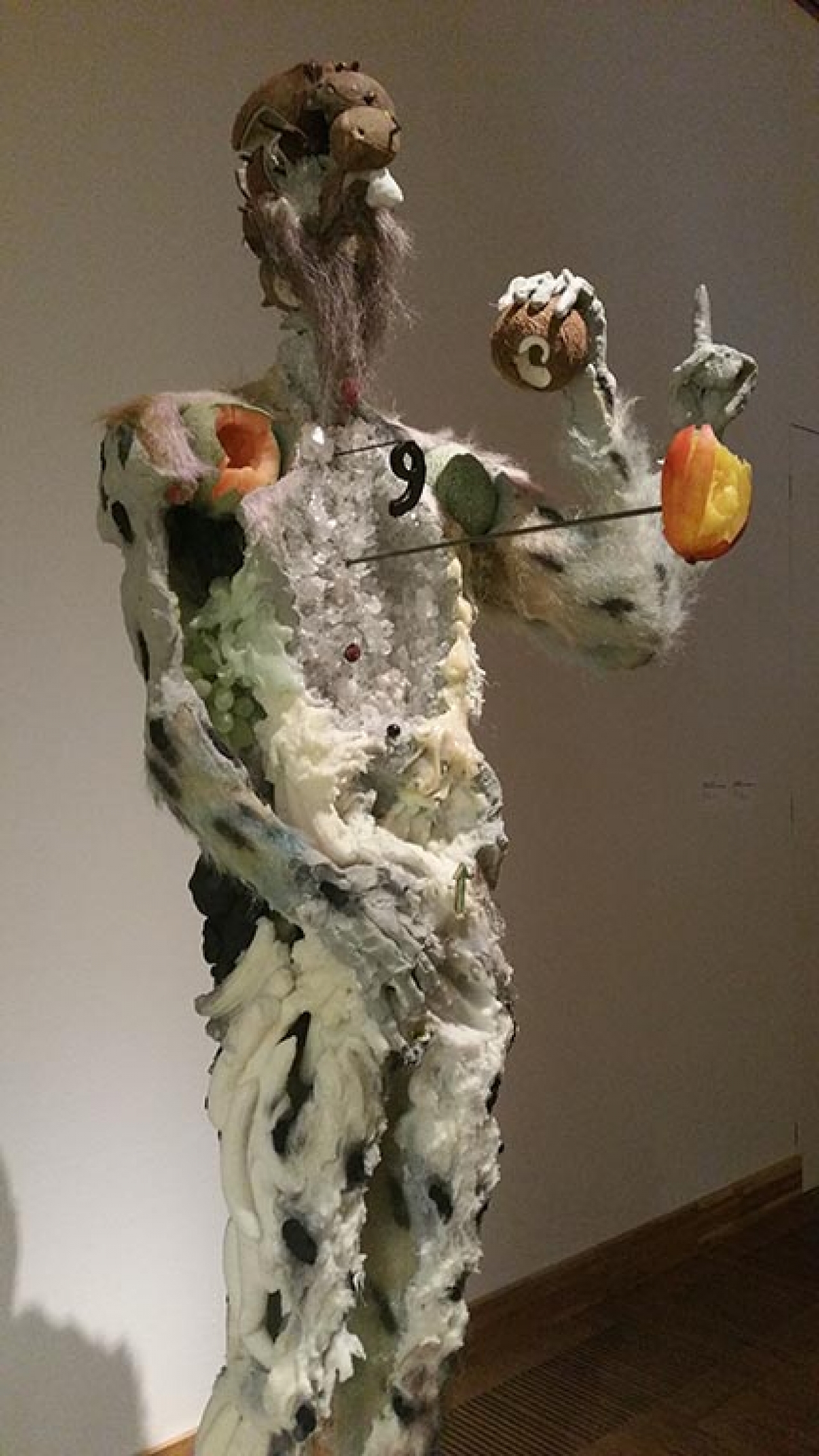 De viermeter hoge intimiderende reus komt in actieve pas op je af, waardoor de bezoeker zich klein en nietig voelt in de ruimte. Toch ervaren we ook een soort affectie voor de gigantische creatie, vergelijkbaar met de sympathie voor de ‘Vriendelijke Oude Reus’. Hoe langer de bezoeker blijft kijken naar de enorme gestalte, hoe meer hij gaat zien: weggeschaafde huid, pinnen, druiven, kokosnoten, piepschuim, schelpen, kristallen, bananen. De overvloed aan materiaalgebruik en toevoegingen aan de creatie, veroorzaakt een mysterieuze uitstraling. Ook de hoofden met grotachtige kristallen openingen en de aan elkaar gehechte hoofden, zijn mystiek.