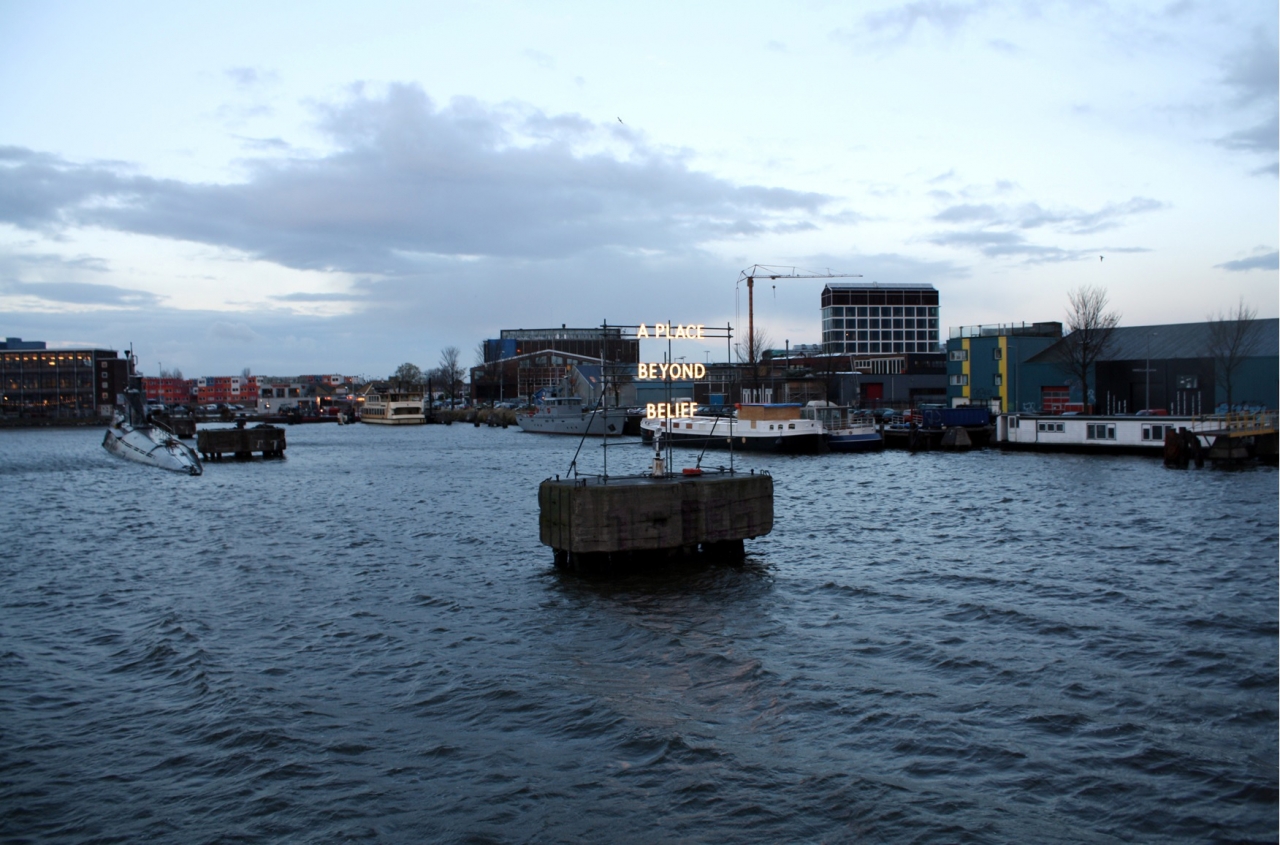 Wanneer je tussen 2013 en 2016 met de pont vanuit het Centraal Station van Amsterdam richting de NDSM-werf voer, kwam je net voor het aanmeren een kunstwerk van Nathan Coley tegen. De zin ‘A place beyond belief’ weerspiegelde in het water en ’s avonds zetten de verlichte letters zich stevig af tegen de donkere hemel.