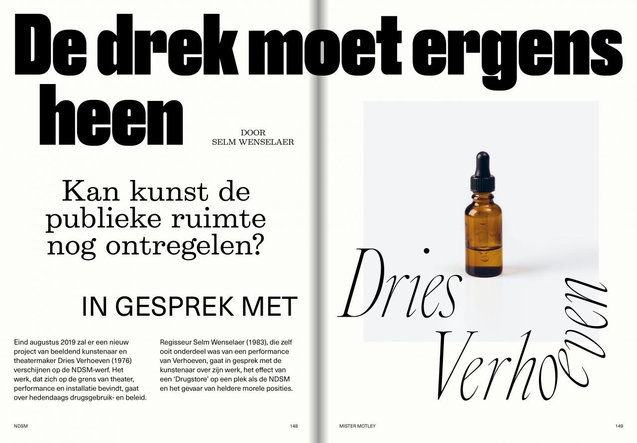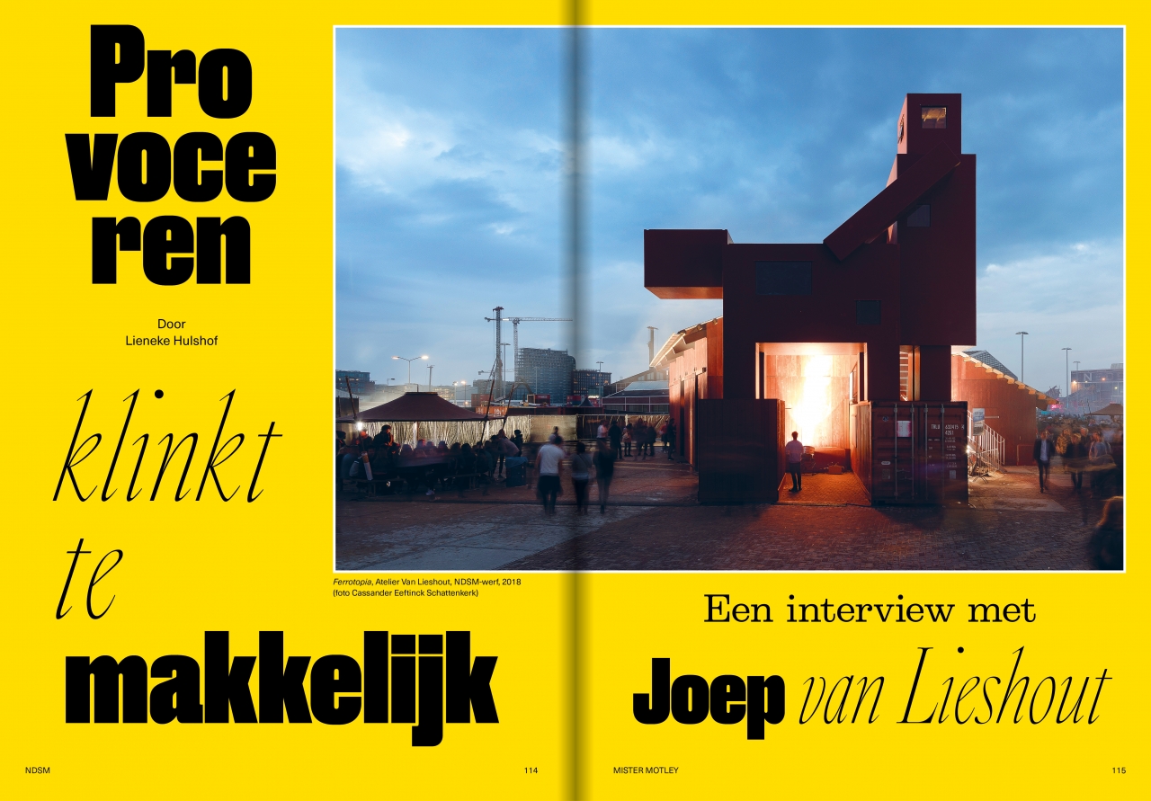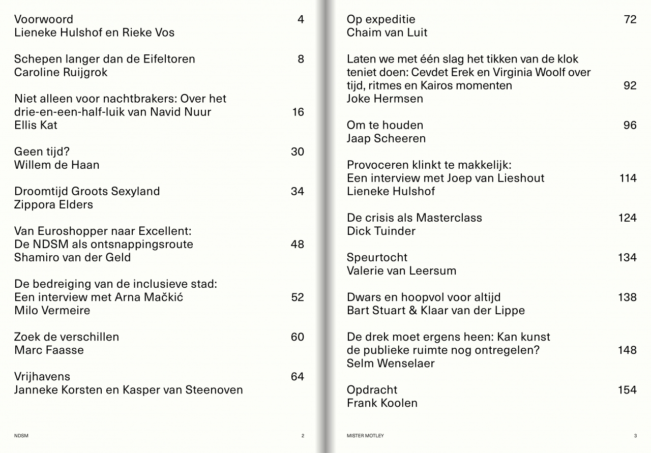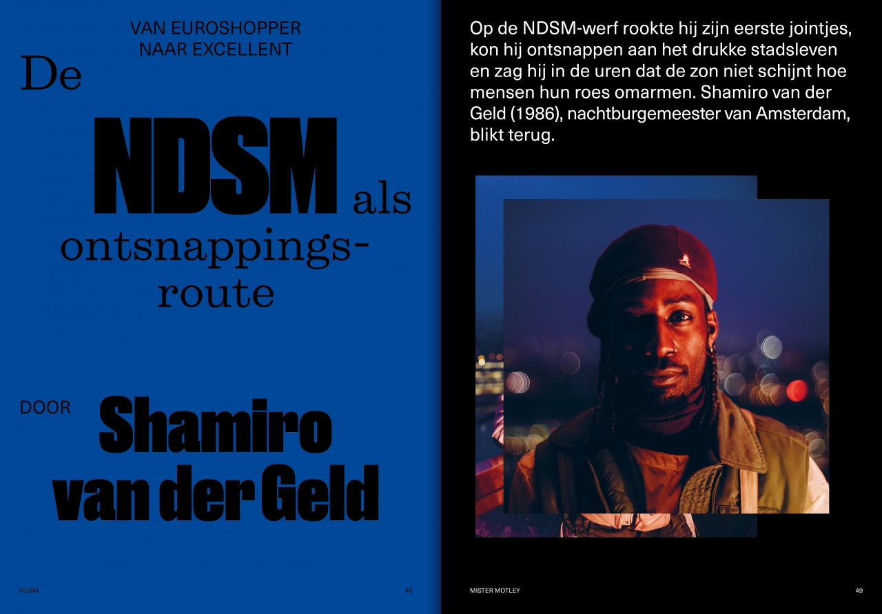 Samen met Stichting NDSM-werf publiceert mister Motley op 17 april een uitgave over gentrificatie, kunst in de openbare ruimte, het nachtleven en stedelijke ontwikkeling. Met tientallen schrijvers en kunstenaars is er gewerkt aan het NDSM Magazine om antwoord te vinden op de vraag hoe we in een samenleving die steeds meer draait om efficiëntie, ruimte kunnen behouden voor dingen die dat per definitie niet zijn? Het is een kleurrijke verzameling geworden van essays, interviews en kunstenaarsbijdrages, vormgegeven door studio Bas Koopmans. De lancering op woensdag 17 april in Sexyland zal gaan over de ervaring die men heeft wanneer ze de pont verlaten en een paar uur spenderen aan de andere kant van het water. Met artificieel licht, een klok die 24 keer sneller tikt dan onze horloges en verschillende kunstenaars en denkers wordt 24 uur op de NDSM nagebootst. Juist omdat hier de dagelijkse tijd zo vaak wordt genegeerd, wordt versneld, vergeten of vertraagd en op ieder moment van de dag een andere gedaante aanneemt.