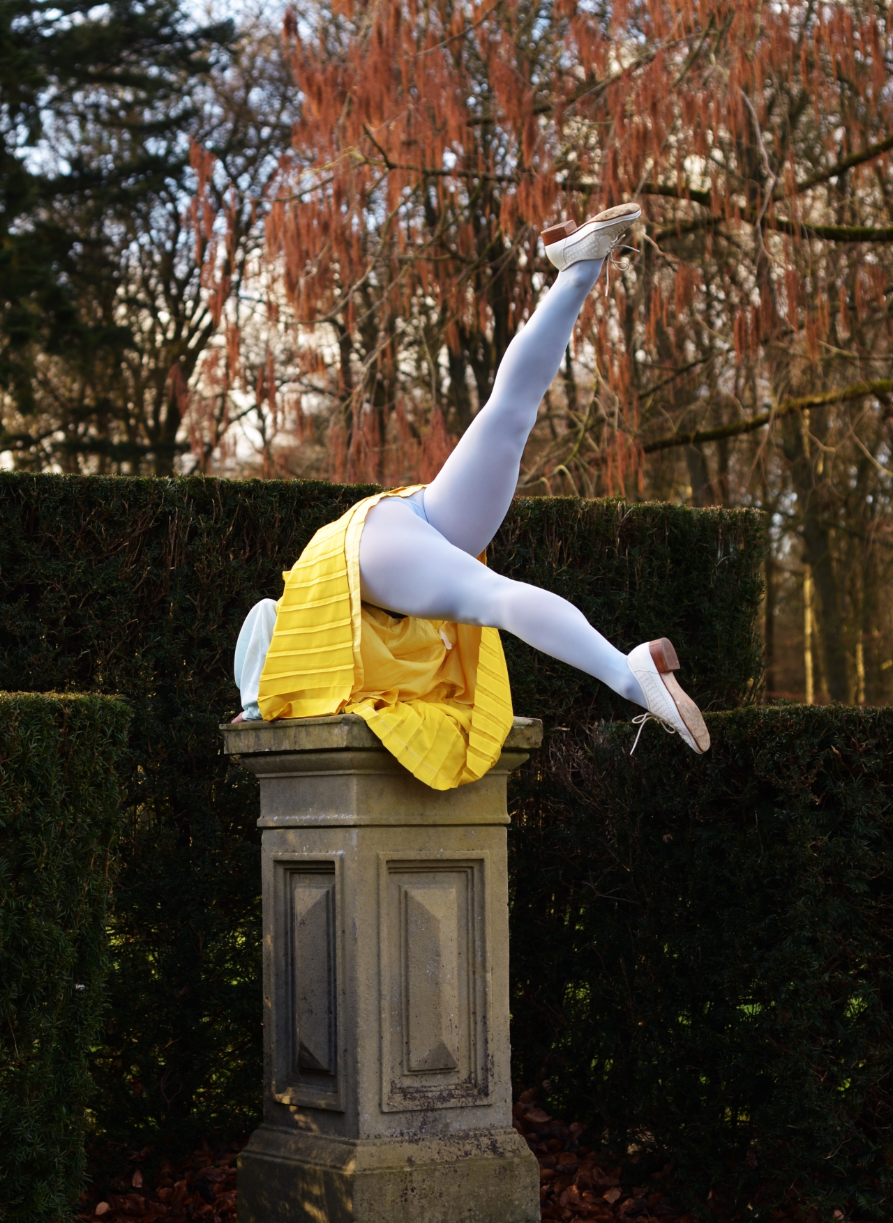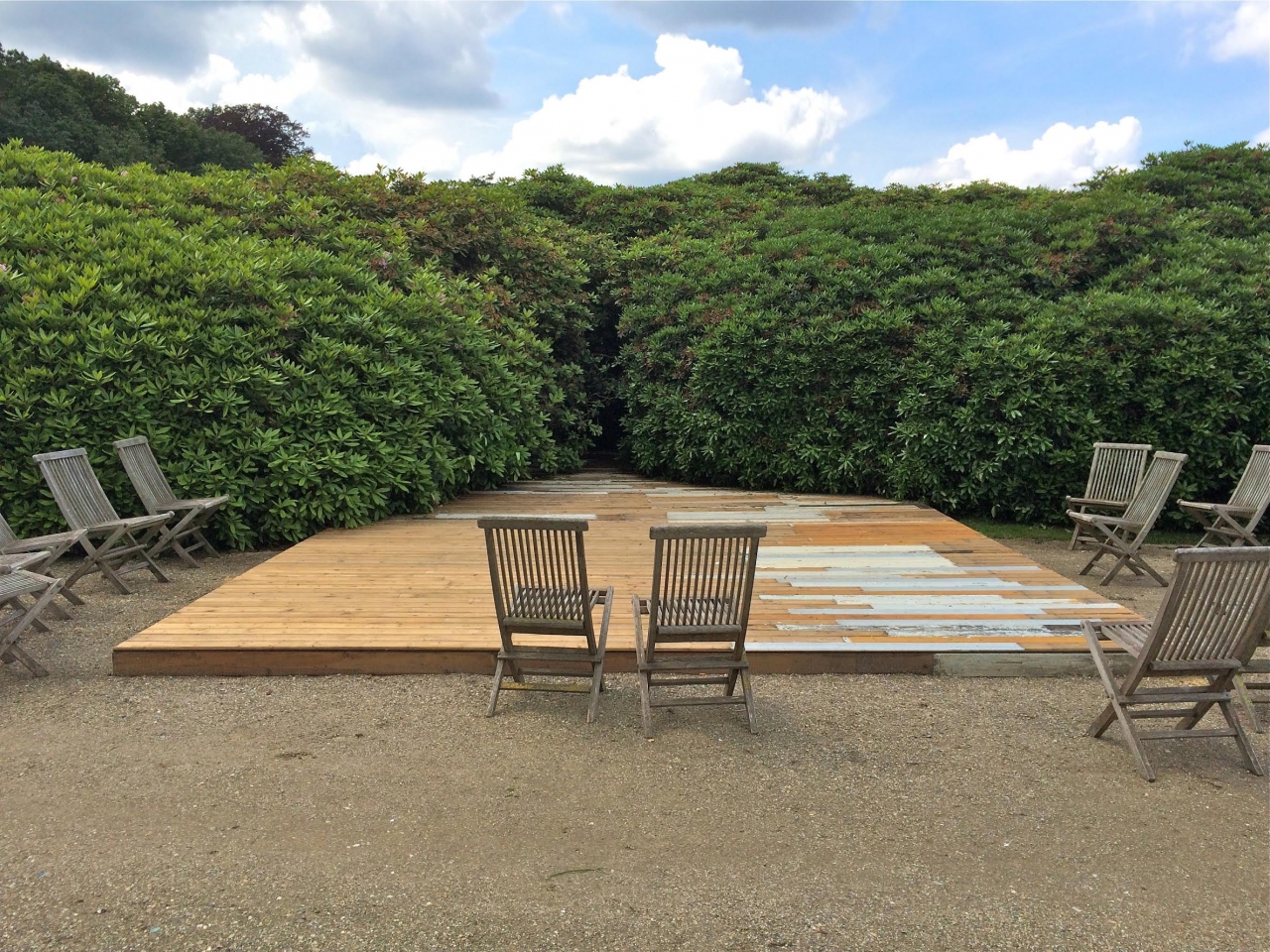 Verderop in de tuin heeft kunstenaar Krijn de Koning speciaal voor de expositie een Ballroom ontworpen, een speelse en minimalistische sculptuur. De ruimtelijke constructie beweegt zich tussen de grens van beeldende kunst en architectuur: de kleur en het materiaal is expressief, de vorm is helder. In de Ballroom kan gedanst worden. De dansvloer bestaat uit twee verschillende realiteiten: een gedeelte bevindt zich letterlijk in de openlucht, maar loopt door in de ontbladerde rododendronstruik, waardoor daar een ietwat obscure plek is ontstaan. Hier kun je schuifelen en zoenen. In de openlucht kun je je vrij bewegen en je beste wals laten zien. Een sprookje dat hooguit bedorven kan worden als je jurk blijft haken aan de takken die de dansvloer versperren. De Koning heeft de fysieke ruimte een nieuwe identiteit gegeven, en er wordt gespeeld met de perceptie van de bezoeker om deze bewust te maken van de omgeving.