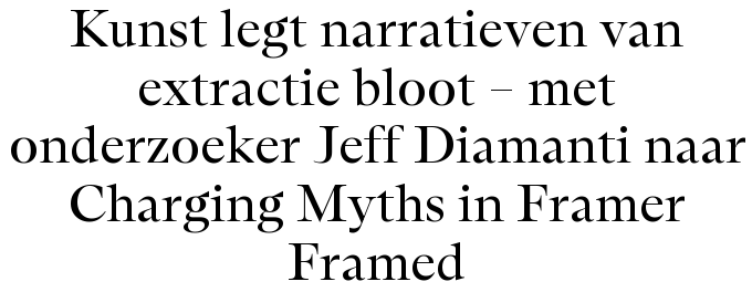 Voor De ontmoeting bezoekt Fabienne Rachmadiev samen met Jeff Diamanti, onderzoeker en assistant professor Environmental Humanities aan de Universiteit van Amsterdam, de tentoonstelling Charging Myths in Framer Framed. Ze bespreken de zelfrechtvaardiging die grote bedrijven toepassen om extractie van grondstoffen te legitimeren, hoe het narratief van energietransitie andere motieven kan vertroebelen en de gevolgen die gepaard kunnen gaan met schaal.