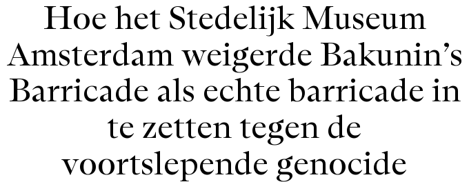 Het Not Surprised Collective verzocht het Stedelijk Museum Amsterdam in juni 2024 om Ahmet Öğüts Bakunin’s Barricade in te zetten voor protesten. Het collectief voelde zich genoodzaakt de stem van de beeldende kunsten te laten horen tegen de voortdurende genocide. Het werk werd in 2020 door het museum verworven, en ligt sindsdien in afwachting in het depot. Maar de barricade begon een eigen leven te leiden, en werd zo gevangen in het kruisvuur van het politieke discours. De plotselinge relevantie ervan kwam voort uit stilistische overeenkomsten met de bouw van studentenkampementen tijdens de pro-Palestinaprotesten van mei 2024 én uit de conceptuele schoonheid ervan – een barricade die niet alleen ontworpen was als een symbool, maar ook als iets inzetbaars, om te worden gebruikt op momenten van sociale transformatie.