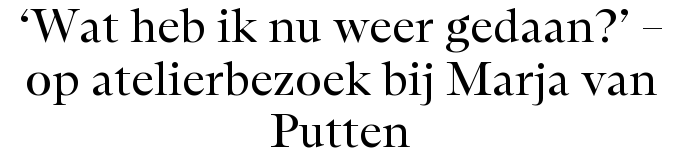 ‘Ik word zelf steeds normaler, maar mijn werk wordt steeds gekker’, vertelt Marja van Putten als Alex de Vries bij haar op atelierbezoek gaat. Als schilder werkte Marja jarenlang met een systeem waarmee ze haar doeken opbouwde met negen vakken die ze indeelt in drie basiskleuren: rood, groen en wit, en contrasten zoals binnen en buiten, hard en zacht. Geen systeem om het systeem, maar een houvast om haar composities dynamisch te maken. Drie jaar geleden gooide Marja het roer om en begon aan haar 2D-werken onder de noemer FemmeBRUT: textiele sculpturen van een groep gestalten met uiteenlopende achtergronden en karakters.