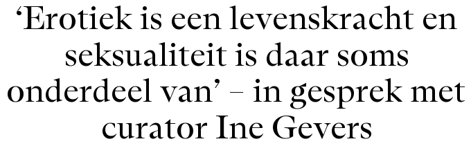 Ine Gevers cureerde samen met Morgan Catalina COME ALIVE, een tentoonstelling waarin de waarde van erotiek werd uitgediept. Het ging niet over sexy lijven, harde seks of orgasmes, maar over hoe we erotiek kunnen zien als een kracht om samen te komen en problemen in de wereld aan te gaan. Daarbij werd de vraag gesteld welke lichamen in onze maatschappij zich seksueel mogen uiten en welke niet. Lieneke Hulshof ging met Ine Gevers in gesprek.