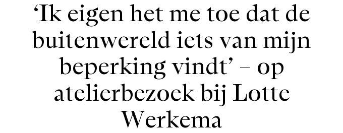 Typerend voor het werk van Lotte Werkema is dat ze toont hoe ze haar aanwezigheid moet bevechten, terwijl ze tegelijkertijd door haar rollator, rolstoel en lichamelijke hulpstukken juist duidelijk zichtbaar is. ‘Mensen zijn zo vrij mijn lijf te becommentariëren, maar dat kan ik beter zelf doen. Dan ligt de bal bij mij. Als de goegemeente, de kunstwereld of de politiek daar maatschappelijk verzet in ziet, dan accepteer ik dat.’ Alex de Vries bezocht haar atelier en ging met Lotte in gesprek.