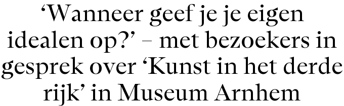 Tom Jansen Klomp bezoekt Museum Arnhem waar de tentoonstelling Kunst in het derde rijk – verleiding en afleiding te zien is: een verzameling schilderijen en beeldhouwwerken die in de jaren 1930 en 1940 van de vorige eeuw werden gepresenteerd als meesterwerken uit nationaalsocialistisch Duitsland. Op zaal raakt Tom in gesprek met een tweetal bezoekers over de morele dilemma’s die de werken in deze tentoonstelling oproepen. ‘Mogen we deze schilderijen mooi vinden, en kunnen we deze schilderijen zelfs mooi vinden?’