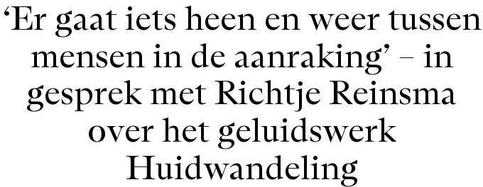 Richtje Reinsma vatte het plan op om mensen met audio te laten wandelen door het lichaam. Het idee leidde tot een uitgebreid onderzoek, ze sprak met onder meer een psycholoog, dermatoloog, vroedman en haptotherapeut. Wat is het toch dat onze buitenste laag, nota bene ‘dode’ huidcellen, zo ontzettend gevoelig is? Op welke manier borgt de huid een vorm van begrenzing zonder volledig afgesloten te zijn? Welke rol speelt de huid in ons hechtingsproces? Laure van den Hout ging in gesprek met Richtje over al deze vragen die leidden tot het geluidswerk Huidwandeling.