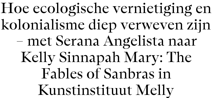 Met grafisch kunstenaar Serana Angelista bezocht Leana Boven kunstinstituut Melly, voor de tentoonstelling ‘Kelly Sinnapah Mary: The Fables of Sanbras’. Kelly Sinnapah Mary maakt interdisciplinair werk rond sociale ongelijkheid, uitbuiting van de natuur en ontheemding binnen de context van Guadeloupe, waar ze woont en werkt. Haar spirituele en mystieke leggen de verbindingen bloot tussen ecologische vernietiging en kolonialisme. ‘Sinnapah Mary positioneert zich in haar werk als het centrum, of als een brug, en belichaamt zo een verbinding tussen mensen, dieren, en aarde.’