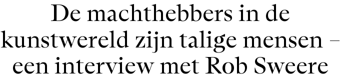 “Het is een wonder dat ik nog werk heb”, zegt Rob Sweere lachend aan het eind van ons gesprek. Hoewel Sweere al sinds de jaren tachtig werkzaam is als professioneel kunstenaar, heeft hij aardig wat aan te merken op de kunstwereld. Hij is zelfs gaan twijfelen of het tijdperk van de beeldende kunst zoals wij dat kennen in Nederland misschien wel voorbij is. Sinds de jaren negentig leest hij geen kunsttijdschriften meer en in musea slaat hij routineus de zaalteksten over om vooral naar de werken zelf te kijken. Toch was hij bereid om een keer met Mister Motley in gesprek te gaan.