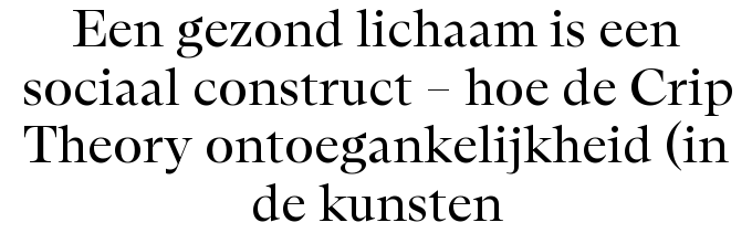 In het Nederlandse kunstlandschap bestaat nog vrijwel geen taal en theorie voor de complexe, veelzijdige ervaringen van mensen met een beperking. Mira Thompson schrijft over haar eigen ervaring en schetst manieren waarop de hedendaagse kunstwereld kan profiteren van de kennis en kunst die gehandicapte kunstenaars en theoretici hebben voortgebracht. ‘Op een dag realiseerde ik me dat we niet weten hoe we naar gehandicapte lichamen op een podium moeten kijken.’