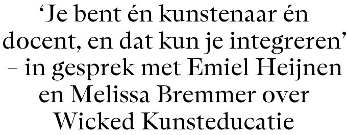 Iemand zei eens tegen ons: ‘you make arts education so sexy’, vertelt Emiel Heijnen. ‘Dat komt vanwege dat imago van kunsteducatie met de aardappelstempels, die soms heel tof kunnen zijn, maar daar zit een soort stoffige sfeer omheen waar wij niets van willen weten.’ Suzanne Dikker gaat naar aanleiding van het verschijnen van Wicked Kunsteducatie in gesprek met Melissa Bremmer en Emiel Heijnen. Het boek is een praktische handleiding die je helpt om in het ontwerpproces terecht te komen en tegelijkertijd onderwijskundige voeding vanuit de kunsten biedt.