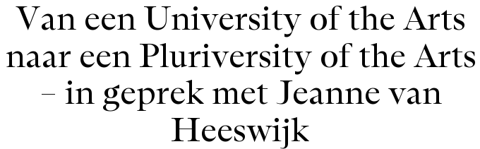 Els Cornelis (relationeel kunstenaar, docent en onderzoeker HKU (Hogeschool voor de Kunsten Utrecht) en Catelijne de Muijnck (programmamaker ArtEZ Studium Generale) spraken met studenten, docenten, wetenschappers, denkers en makers over hoe de Kunstschool van de Toekomst eruit zou kunnen zien. Het resulteerde in elf interviews waarin onderwerpen aan bod komen als sociale rechtvaardigheid, gedekoloniseerde curricula en inclusieve pedagogiek, maar ook: omgangsvormen, methodologieën, waarden, machtsstructuren en het schoolgebouw. Mister Motley publiceert vandaag een van de stukken uit die reeks, een gesprek met kunstenaar Jeanne van Heeswijk.