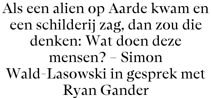 Tijdens de opbouw van zijn tentoonstelling I’m at 4% gaat Ryan Gander in gesprek met collega-kunstenaar Simon Wald-Lasowski. In hun beider oeuvres speelt het gegeven van tijd(sbeleving) een grote rol. Gander is van mening dat het kapitalisme, het onderwijs, en zelfs de kunstwereld te zeer gericht zijn op tastbare zaken, op antwoorden. Hij vindt dat we te zeer begaan zijn met de dingen die we zien en te weinig met de dingen die we voelen en ervaren. ‘Als ik een superkracht had, zou ik mensen leren meer Kairos te zijn, niet Chronos.’