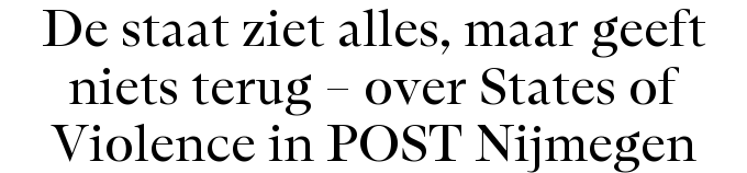 Josephine Broekhuizen bezocht States of Violence in POST Nijmegen, een tentoonstelling die laat zien hoe de systemen die geweld zouden moeten begrenzen – democratie, rechtspraak, media, archieven, politie – zelf beginnen te rafelen. ‘Ik vraag me direct af: als juist deze structuren kwetsbaar worden, hoe weet ik dan nog wat waar is? En wanneer word ik ongemerkt onderdeel van dat geweld?’