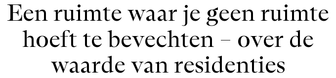 Wat is de oorsprong en toegevoegde waarde van kunstenaarsresidenties en welke invulling ervan helpt het individu zich te ontwikkelen? In welke opzichten mogen residenties van elkaar verschillen, en waar is een eenduidige lijn cruciaal voor de vrijheid en veiligheid van de maker? Kris van der Voorn dook de geschiedenis van de residentie in en toetste de lijnen hiervan aan de hand van de wensen van de residenten zelf en via de wensen van de begeleiders.