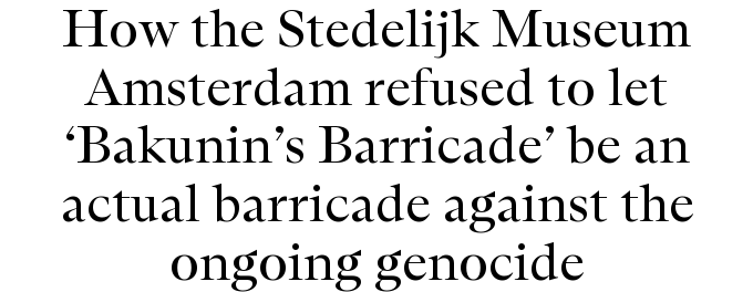 The Not Surprised Collective requested deploying Ahmet Öğüt’s Bakunin’s Barricade from the Stedelijk Museum, in June. They felt compelled to bring the voice of the visual arts to the resistance that other fields were already showing against the ongoing genocide. Purchased in 2020, the work has since been kept in storage, in waiting. But the barricade began to live a life of its own, caught in the crossfire of political discourse. Its sudden relevance sprang from stylistic similarities to student encampment for Palestine constructions from May 2024, and from its conceptual beauty—a barricade designed not only as a symbol but as something deployable, to be used in moments of social transformation, via the contract that accompanied it. (Dit essay wordt op een later moment in het Nederlands op onze site gepubliceerd.)