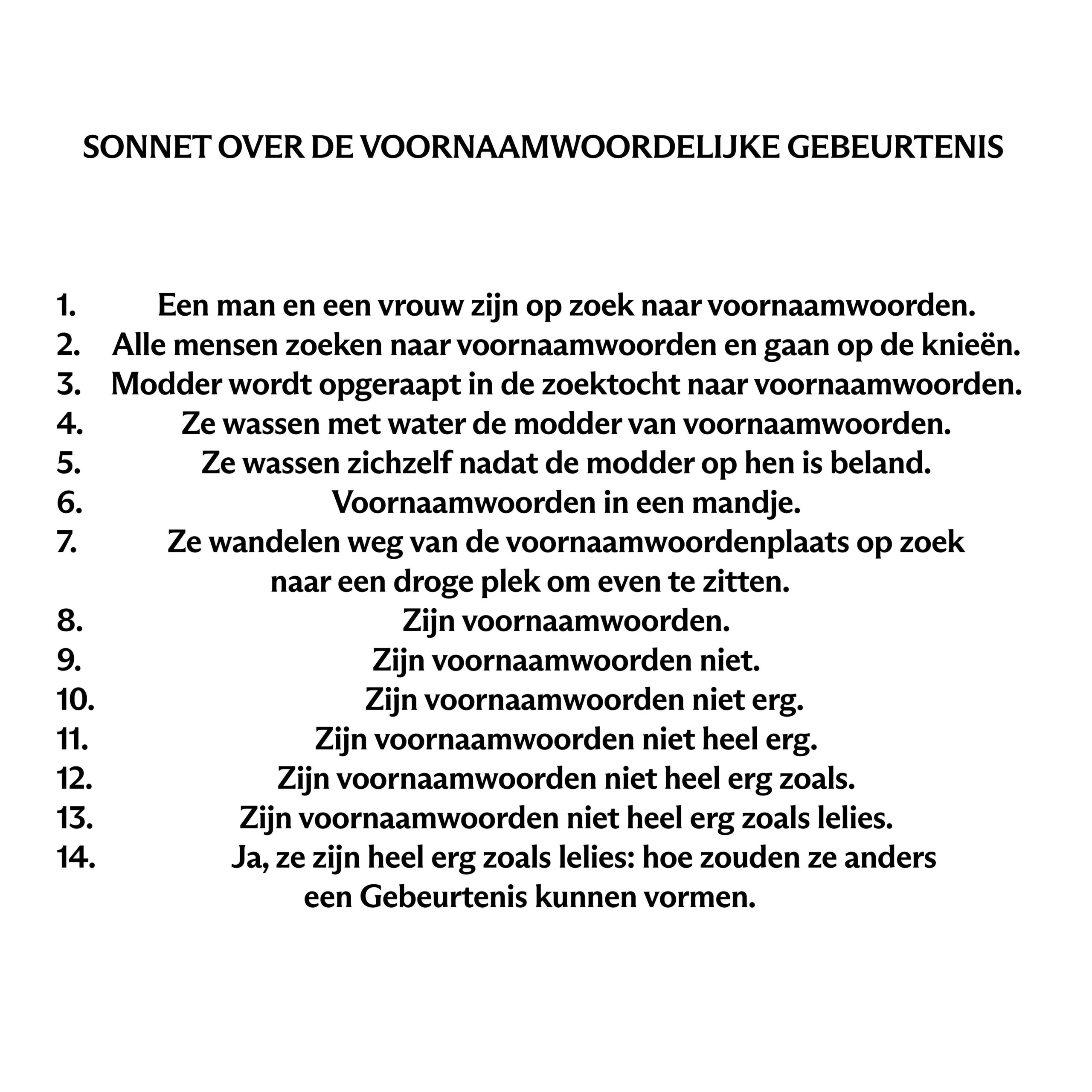 Lena van Tijen woonde in BOZAR, het Paleis voor Schone Kunsten in Brussel, de performance POSSESSIVE USED AS DRINK (ME) – A LECTURE ON PRONOUNS in the form of 15 SONNETS van dichter en classicus Anne Carson bij. Het zette haar aan het denken over het prettig-ongrijpbare dat het lezen, interpreteren en vertalen van poëzie met zich meebrengt: ‘het gevoel dat begrip zich ergens achter mijn hoofd bevindt, op een paar meter afstand. En dat het, zodra ik omkijk, alweer verdwenen is.’