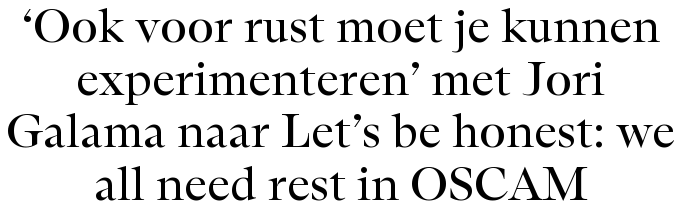 In gezelschap van Jori Galama ging Fiep van Bodegom naar OSCAM voor ‘Let’s be honest: we all need rest’ die werd samengesteld door Lee Stuart. De tentoonstelling bevraagt het vastgeroeste kapitalistische systeem en creëert ruimte voor bredere perspectieven op ons idee van rust. ‘Ik merk dat bij beginnende kunstenaars onderling soms ook een soort ‘druk zijn’ wordt gespeeld. Druk zijn is succesvol zijn, vooral op dat moment in je carrière dat je het gevoel hebt dat je je nog moet bewijzen, en die eerste grote film, dat boek of die solotentoonstelling er nog niet is.’