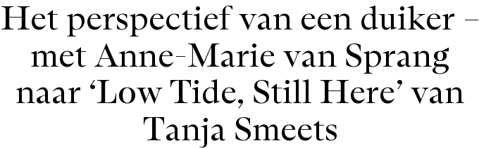 In een duik van een uur kun je hele abrupte wisselingen meemaken alsof je opeens in een totaal ander gebied of seizoen bent terechtgekomen, aldus duiker en beeldend kunstenaar Anne-Marie van Sprang. Van Sprang bezocht samen met teja van hoften ‘Low Tide, Still Here’ van Tanja Smeets in de Bewaerschole in Burgh-Haamstede. De installatie vormt een wonderlijk getijdengebied, het landschap dat tijdelijk droogvalt als het water zich heeft teruggetrokken.